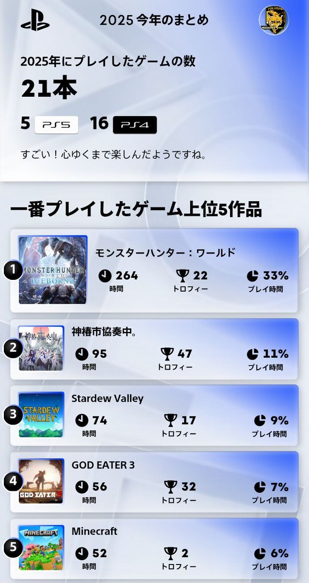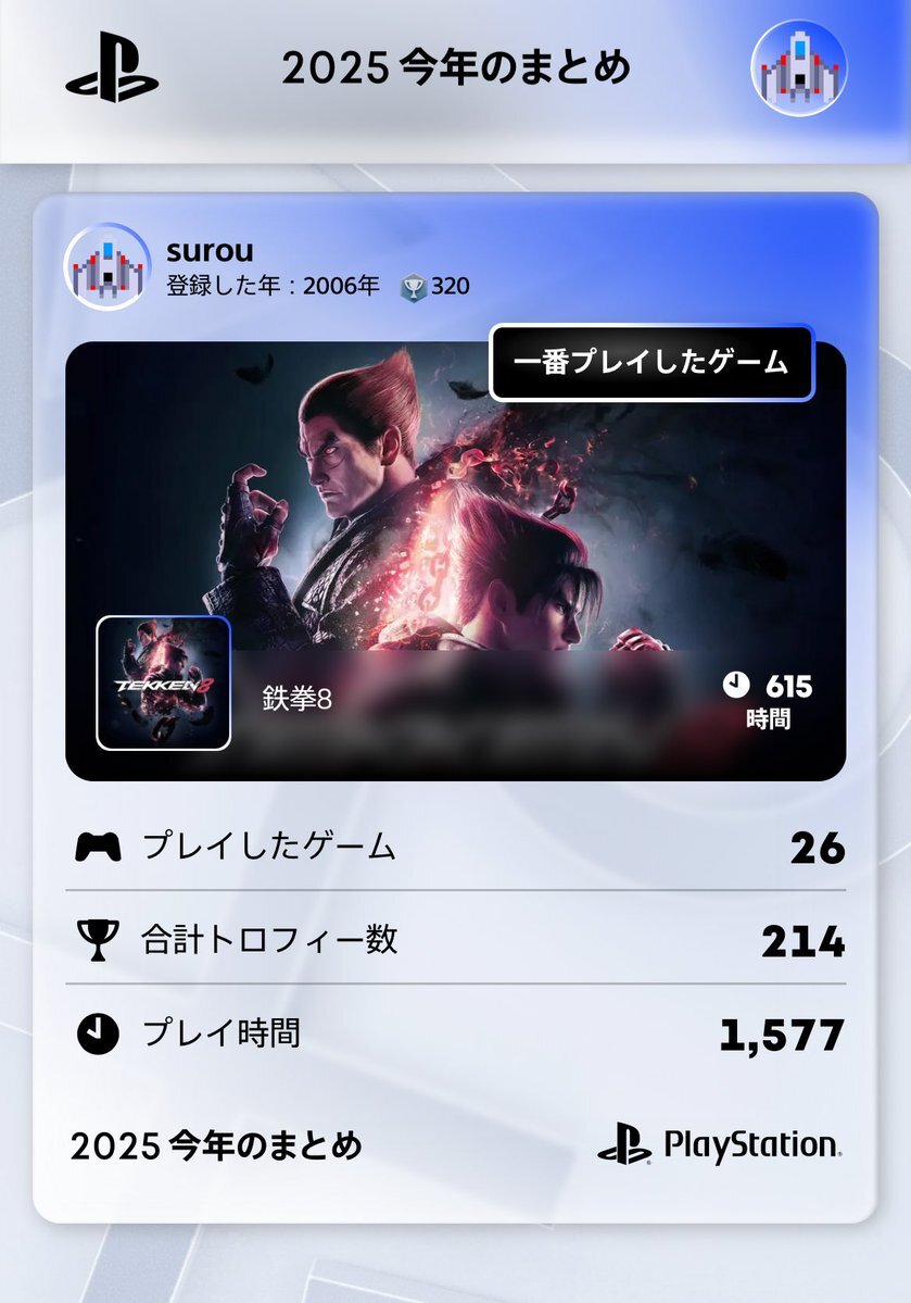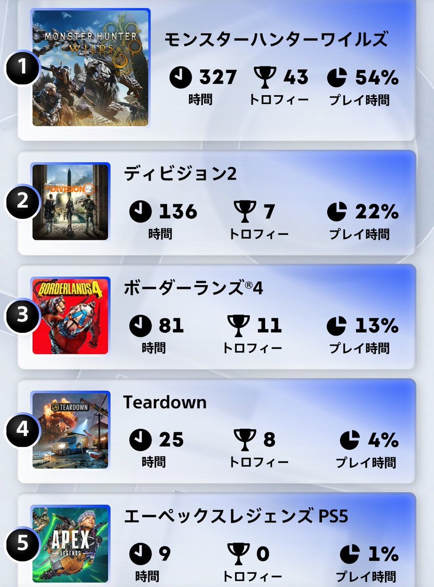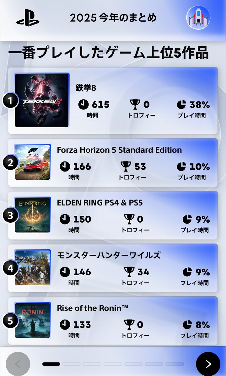 今年は全然新作やらなかったんだね…。 鉄拳はもうご飯とか風呂とかと同じレベルのライフワークなので置いといて、今年はForza5に救われた感。 4番目に146時間も無駄にしたゲームがあるので、この時間をアーマード・コア6のオモシロアセン調査に回せばよかった。 #あなたのPlayStation2025 #PSN #PS5 pic.x.com/lEBYLL1msw