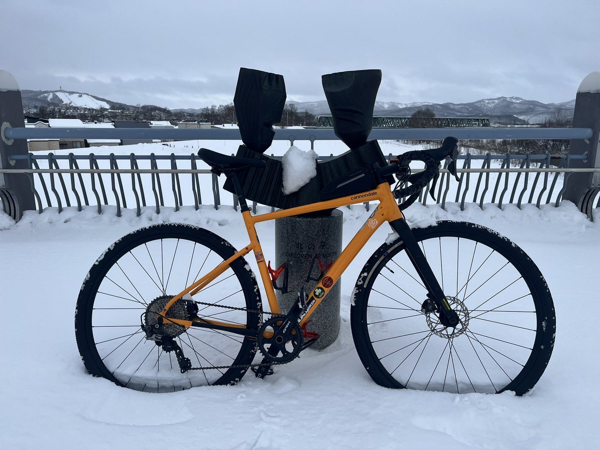 グラベルキングX1(45C)の雪上性能をチェックする。 いや、2月の広島で既に強制チェック済みなのでただ乗りたかっただけ。 #ロードバイク #cannondale #旭川 #グラベルキング #Panaracer #パナレーサー pic.x.com/WXmUWHqVsg