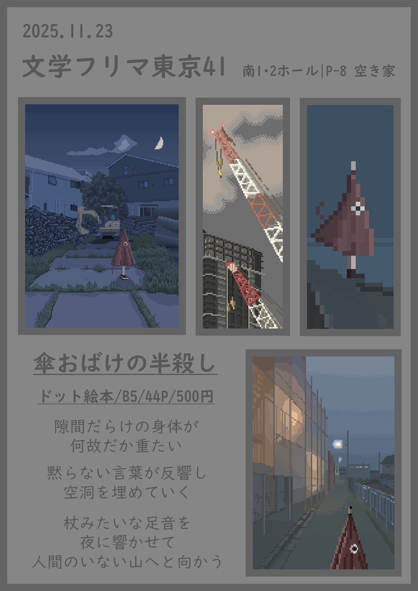 11/23(日)文学フリマ東京41 東京ビッグサイト 南1-4ホール ブース:南1・2ホールP-8 空き家 傘おばけの半殺し B5/44P/500円 人間を恐れている傘おばけが街を抜け出して山に救いを求める物語です 既刊誌1作品のみですがよろしくお願いします! #文学フリマ #文学フリマ東京41 #ドット絵 #pixelart pic.x.com/Mkg51AQ76s