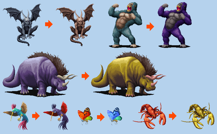 色変えモンスター制作中 目標、年内にモンスター作成を色変え込みで700体! 現在、新規527体+色変え71体=598体!たぶん行ける! #エレマスタ #pixelart #ドット絵 pic.x.com/azq6oyaIK2