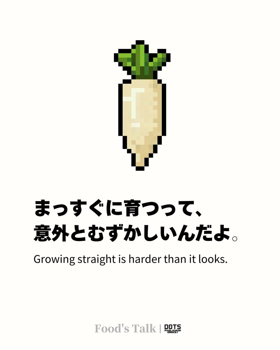 Food's Talk 〜素材たちのひとりごと〜 大根 まっすぐに育って 意外と難しいんだよ。 Growing straight is harder than it looks. DOTS hiraku-designs.com/dots #dotart #pixelart #ドット絵 #FoodTalk #FoodsTalk #素材たちのひとりごと #DOTS #ヒラクデザインズ #スーパーの世界 #食材の気持ち pic.x.com/iQ9ZnBaS64