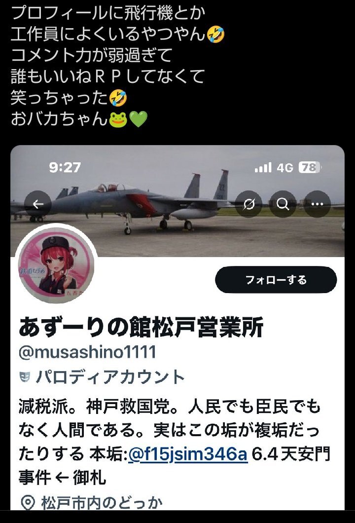 コメント返さず また独り言つぶやいてらぁ🤣 #詐欺師 が レッテル貼りたいとき使う言葉 #Qアノン 🤣 だからバカにされるんだよ🐸💚 pic.x.com/U5P15r24r1 x.com/musashino1111/…
