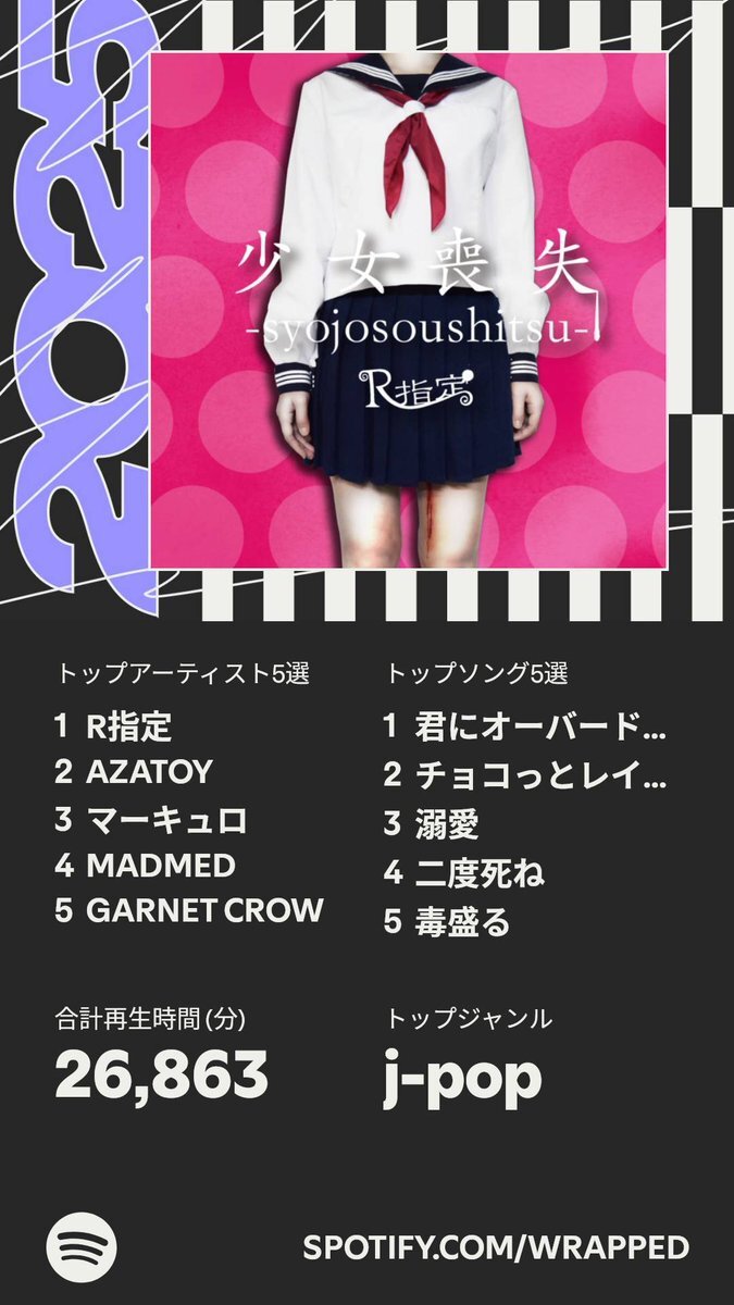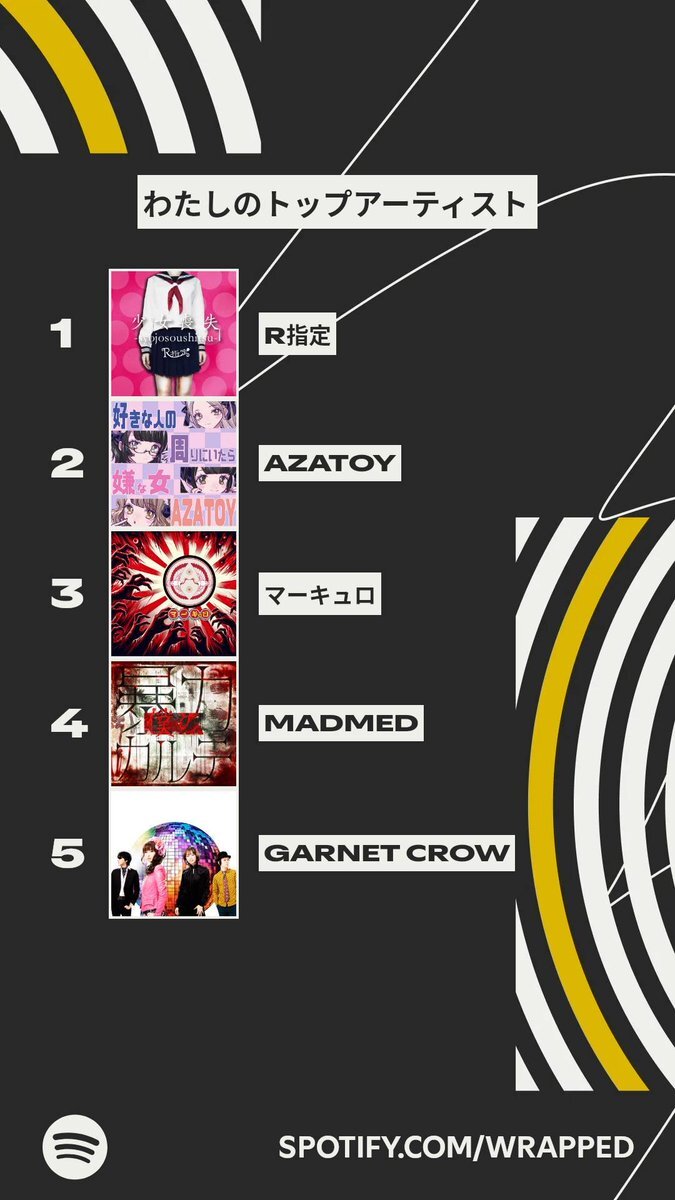 #Spotifyまとめ #Spotifyまとめ2025 1位は予想通り #R指定 だった! 2位は #MADMED さんかな?と予想してたが、 #AZATOY さんだった! 3位に #マーキュロ さん!?そんなに聴いてたかしら? 4位が #MADMED さんでした。 5位は #GARNETCROW さんでしたか! pic.x.com/ftGE3yI1la