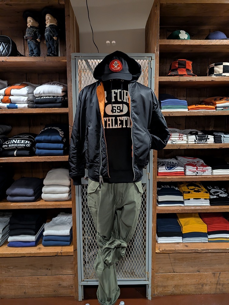 #リアルマッコイズ名古屋 シビリアンのブラックMA-1にM-65フィールドパンツ、インナーにエアフォースのブラックのパーカーの組み合わせ ミリタリーパンツにフライトジャケット、王道の組み合わせです #TheREALMcCOYS #REALMcCOYS #リアルマッコイズ pic.x.com/lMOtwk9MXY