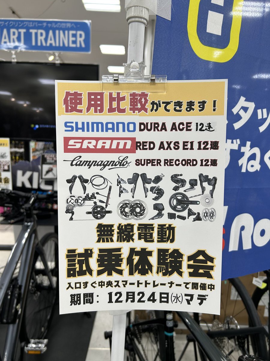 おはようございます! 電動コンポ3大メーカーの体験会やってます、、、!!! スマートローラーで実際に漕ぎながら一気に比較出来るなんてこんなチャンスありませんよ?! 是非ご来店くださいっっ!!! #SHIMANO #DuraAce #SRAM #RED #campagnolo #SUPERRECORD pic.x.com/z7kX1Qbbol