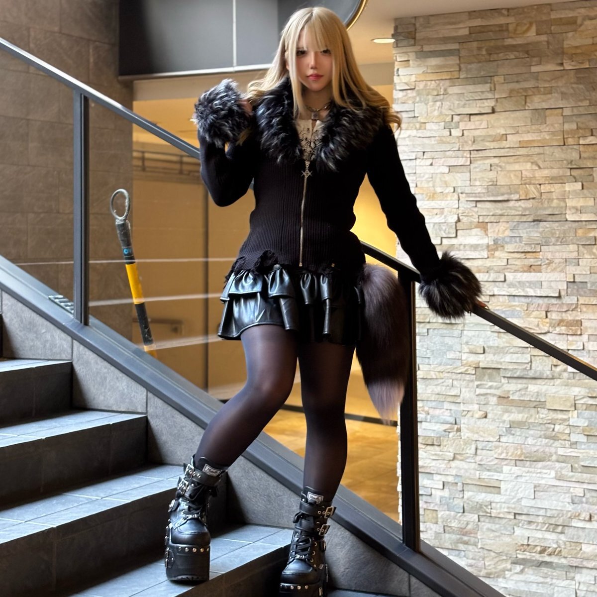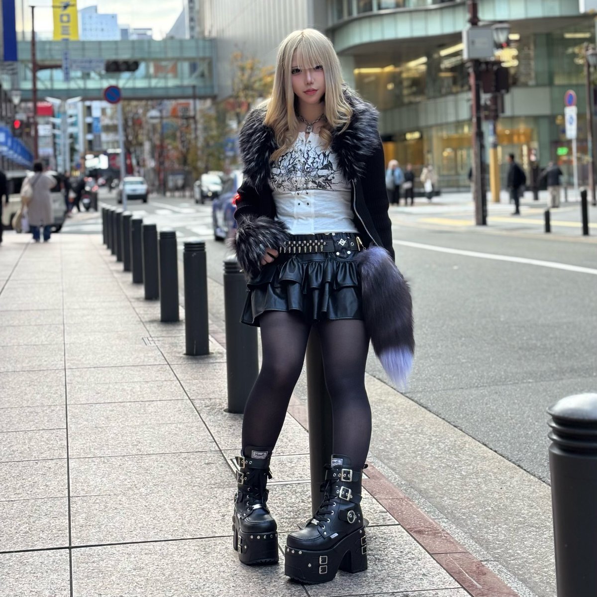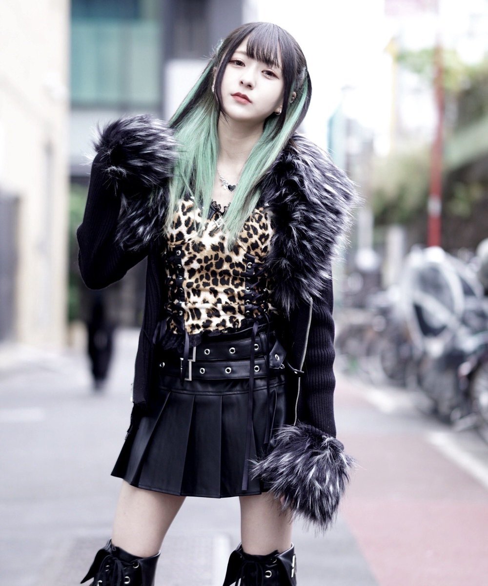 👁🗨REFLEM(レフレム) Street snap📸 ファー付きZIPニットカーディガン ¥15,180 レースアップコルセットキャミソール ¥8,690 ベルト付きプリーツミニスカート ¥14,080 PUレザーフレアレッグカバー ¥10,780 #reflem pic.x.com/jFE3K5qS01