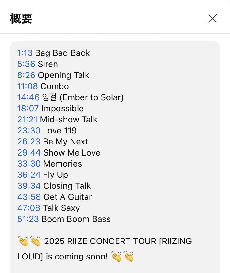 YouTubeに上がってるACLまだ見てない人は是非見てね!タイムスタンプあるから1曲だけでも聞けます 私のオススメはtalk saxyですが全部いいよ〜 #RIIZE pic.x.com/JHlDzDatXO