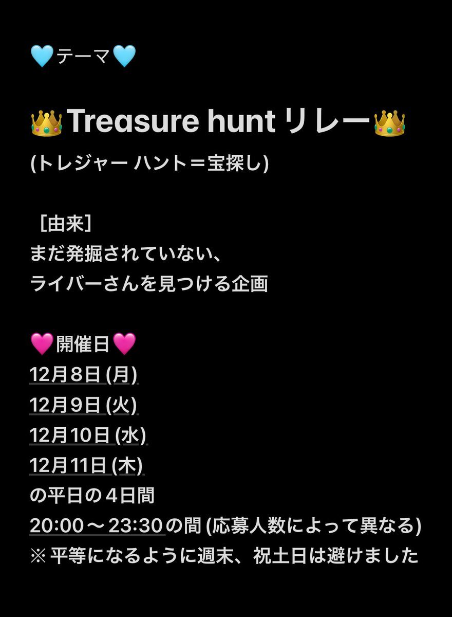 ⭐️⭐️⭐️拡散希望⭐️⭐️⭐️ この度、12月にライバー&リスナーも嬉しい楽しい♡未来に続く企画をご提案させていただきます。 ご賛同していただける 『ライバーさん』大募集です🩷(^^) ♡.*・゚┈┈┈┈┈┈゚・*.♡ 『Treasure hunt 〜出逢いの発掘〜』 【概要】