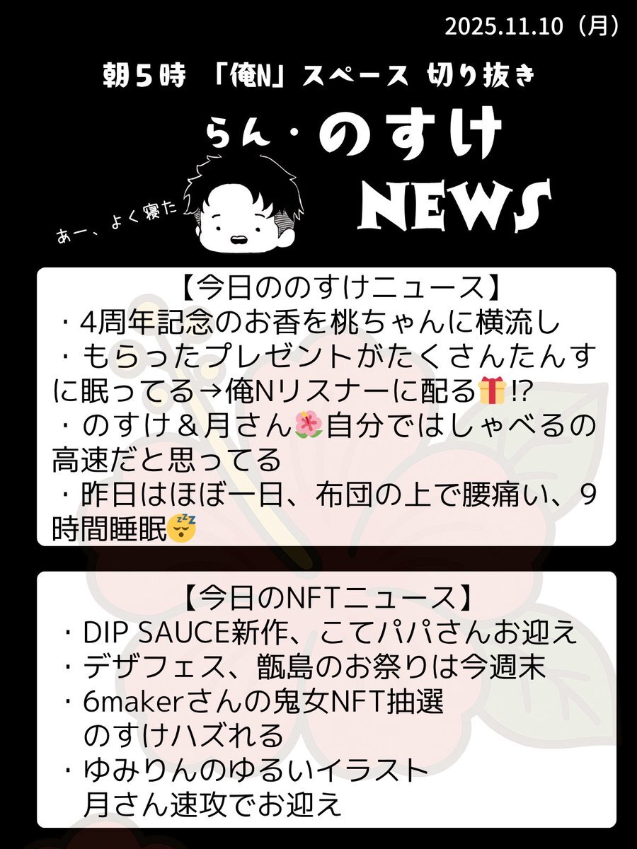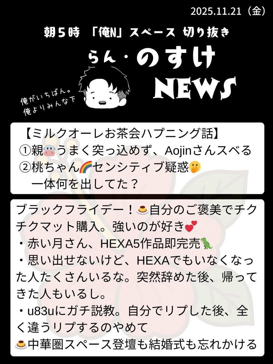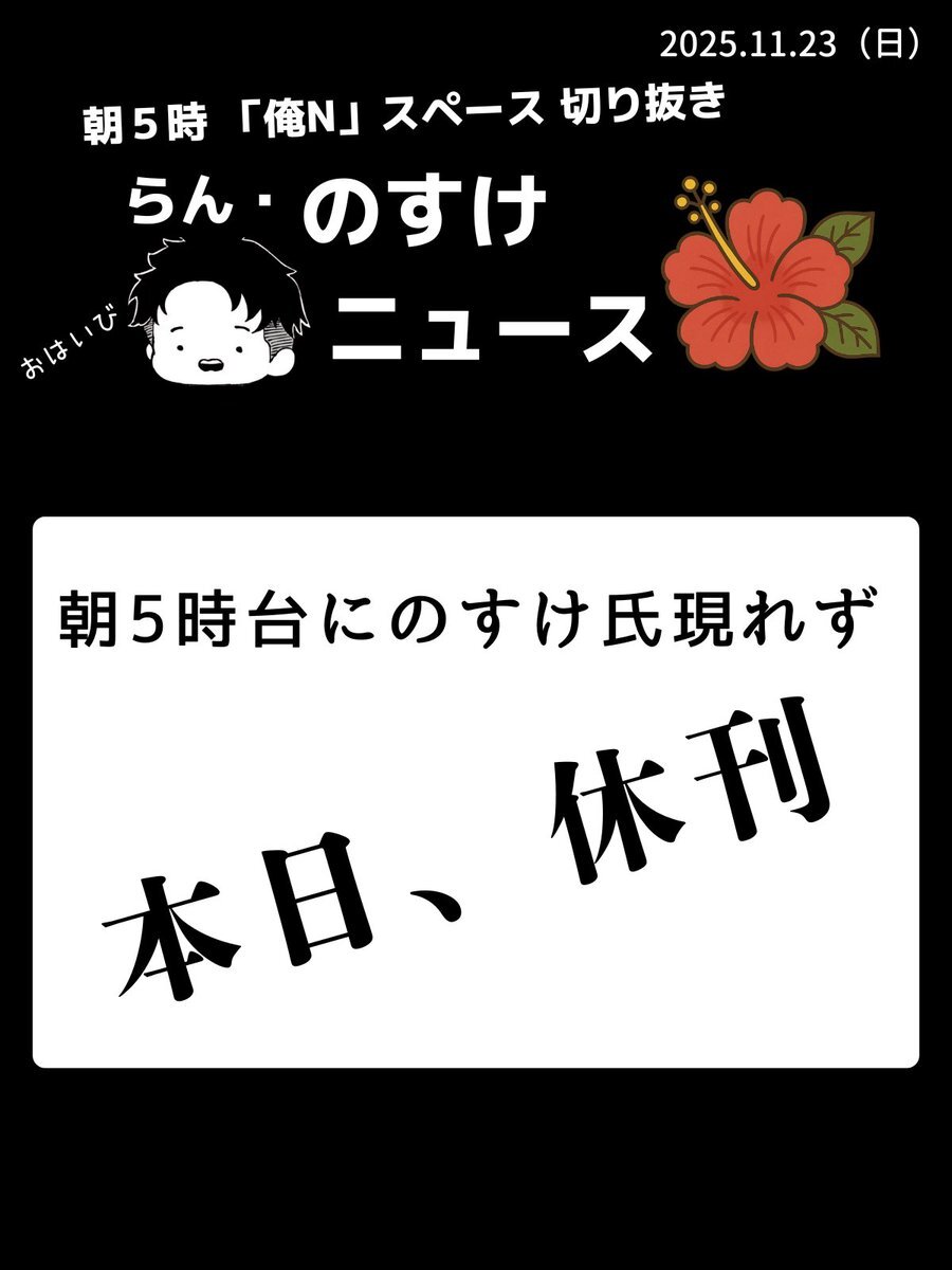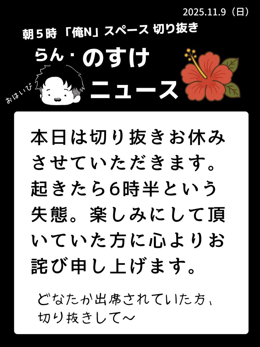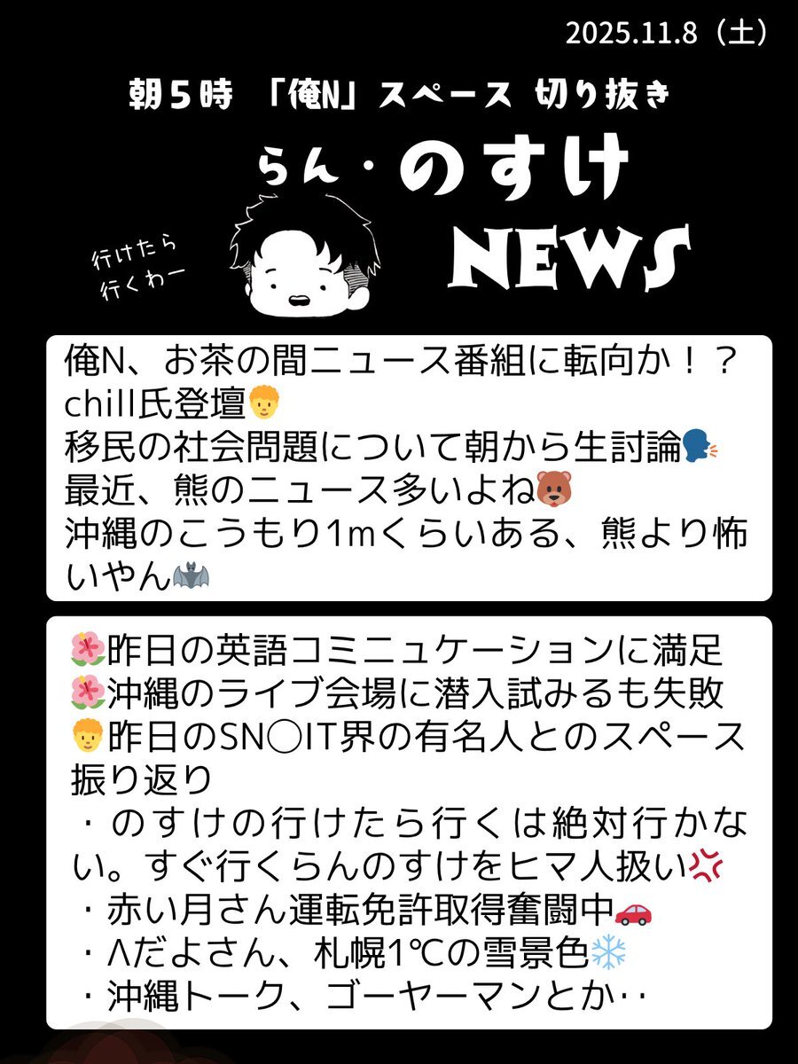 2025.11.10 らん『のすけ』ニュース🌺 朝5時録音なしの『俺N』スペースを愛をもって切り抜き✂️弁当と切り抜きの両立はあらためて忙しい💦 #RNN pic.x.com/i9rfOJz1l3 x.com/nosuke521/stat…
