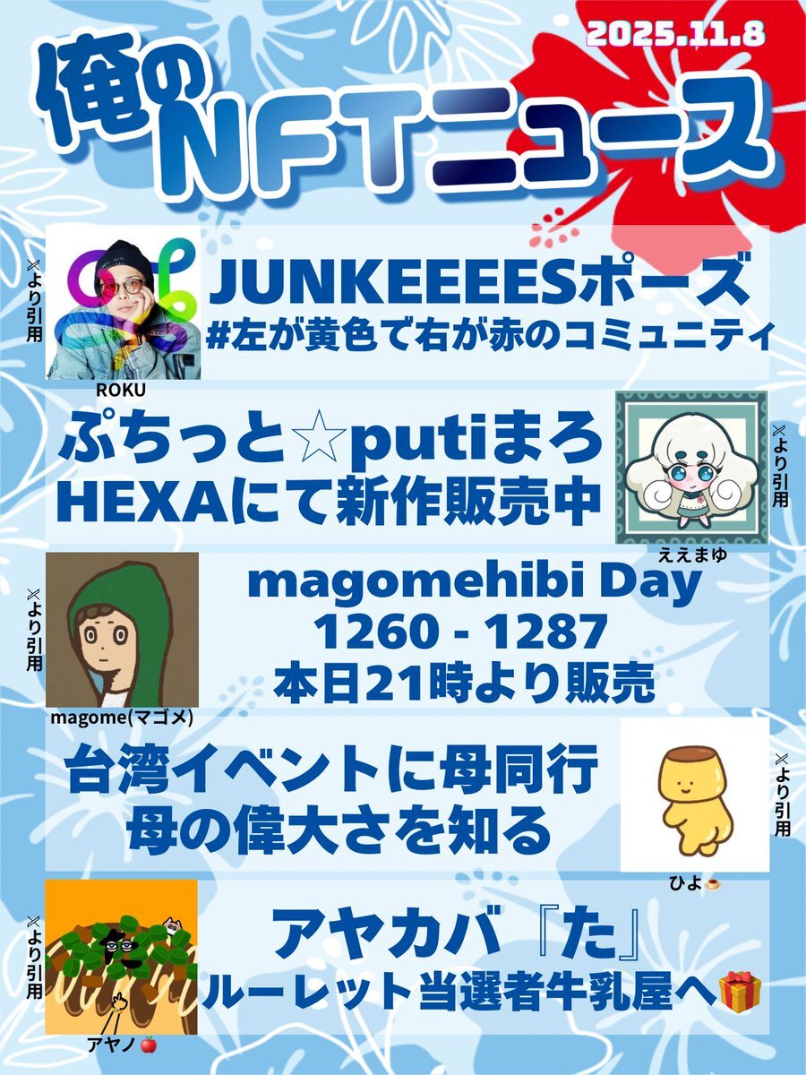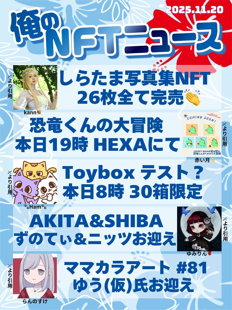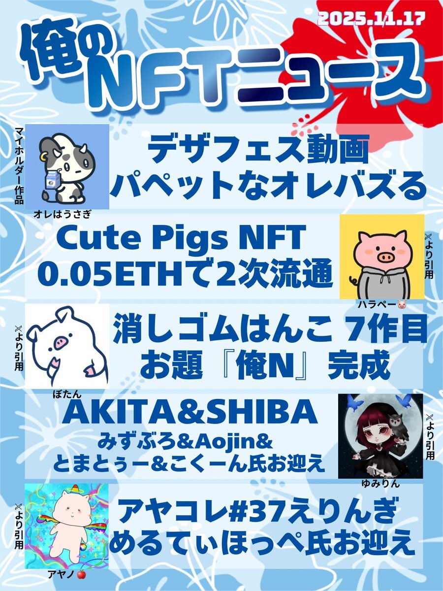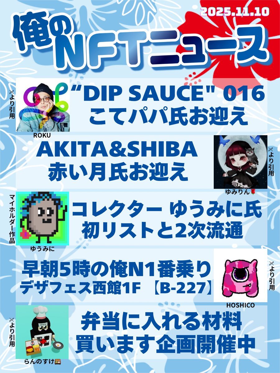 おはいび🌺 デザフェス、HEXA展、大おおがね祭とイベントで盛り上がってますね! もちろんどこにも行ってないけど、流れてくるポストみて楽しんでおります✨ 『11/16(日)俺のNFTニュース』