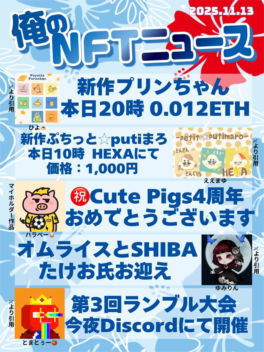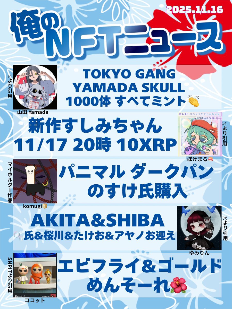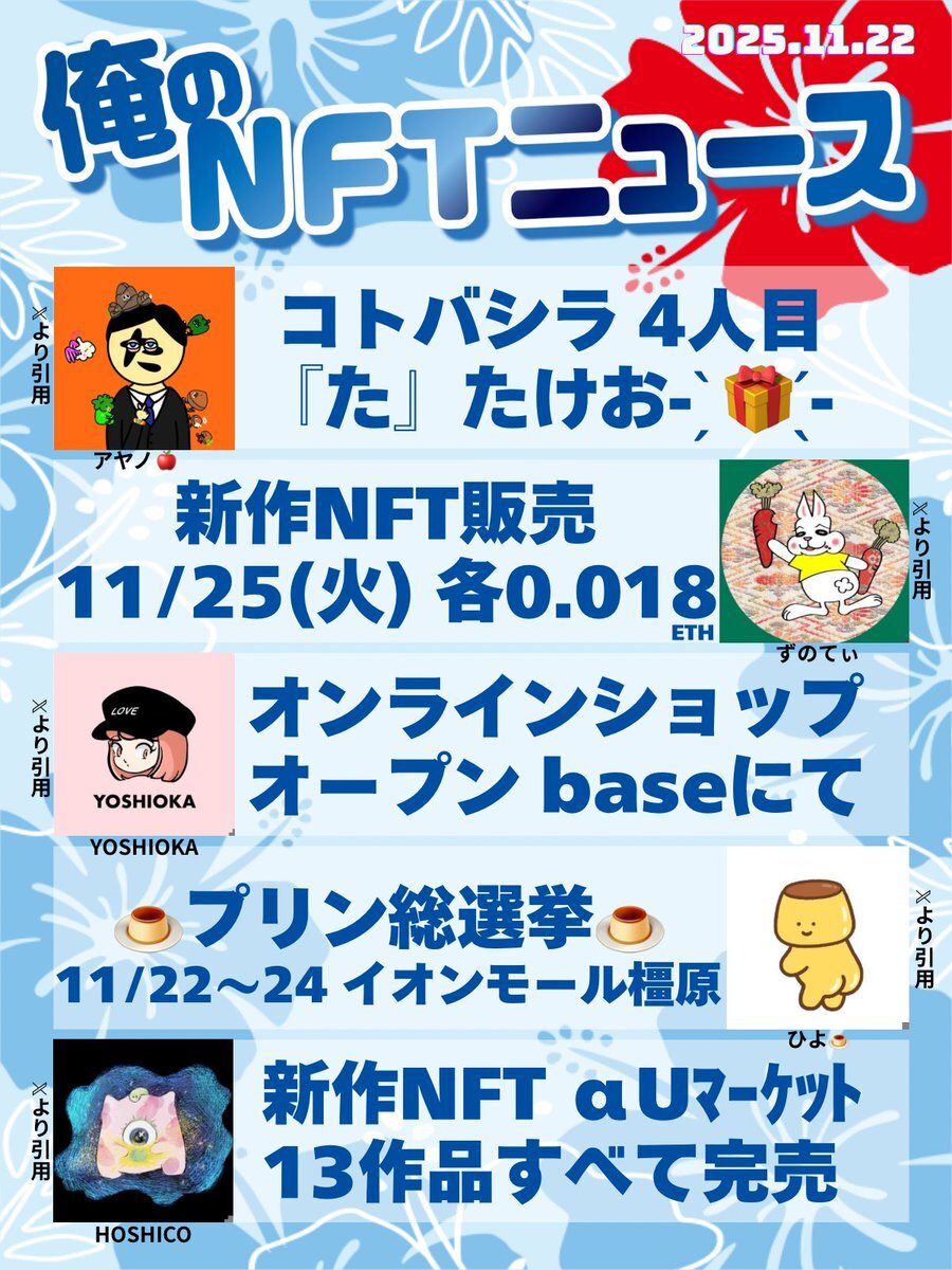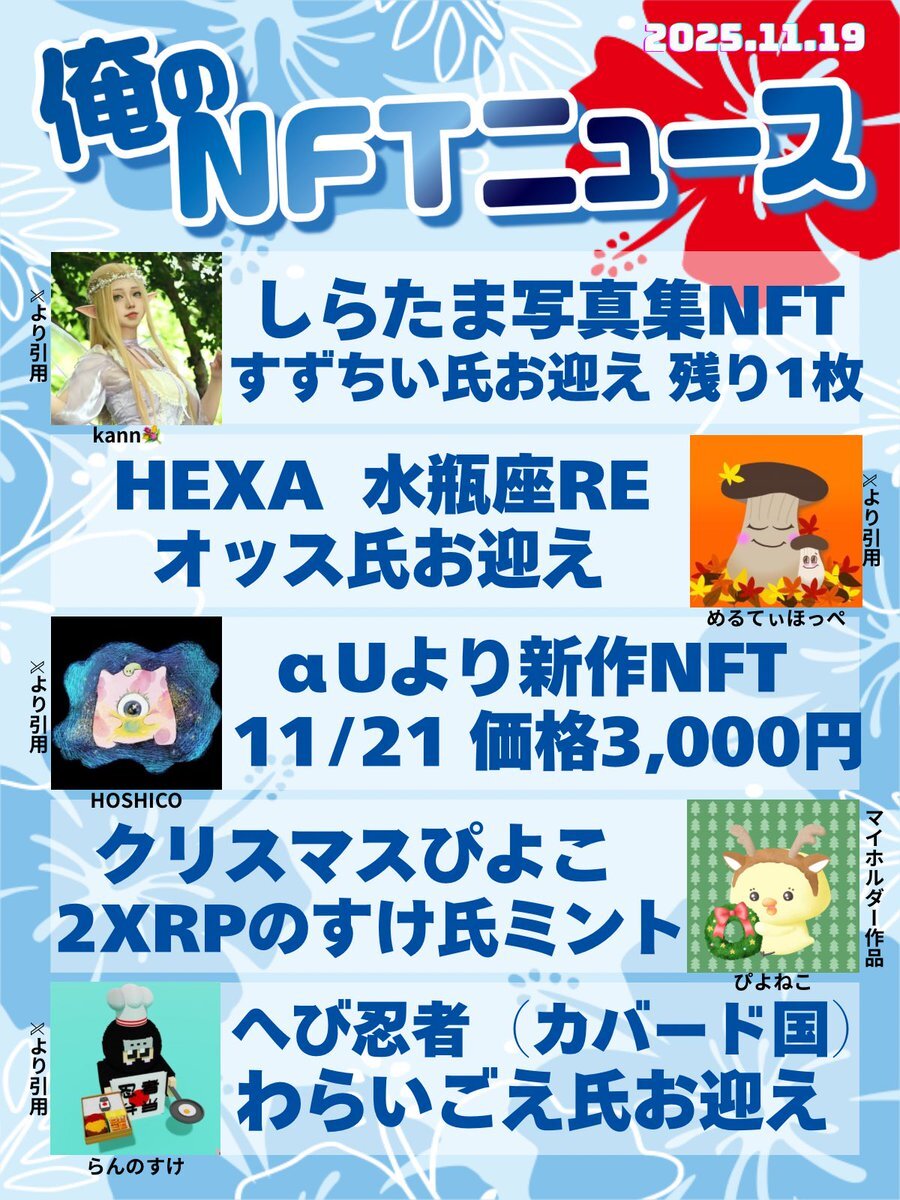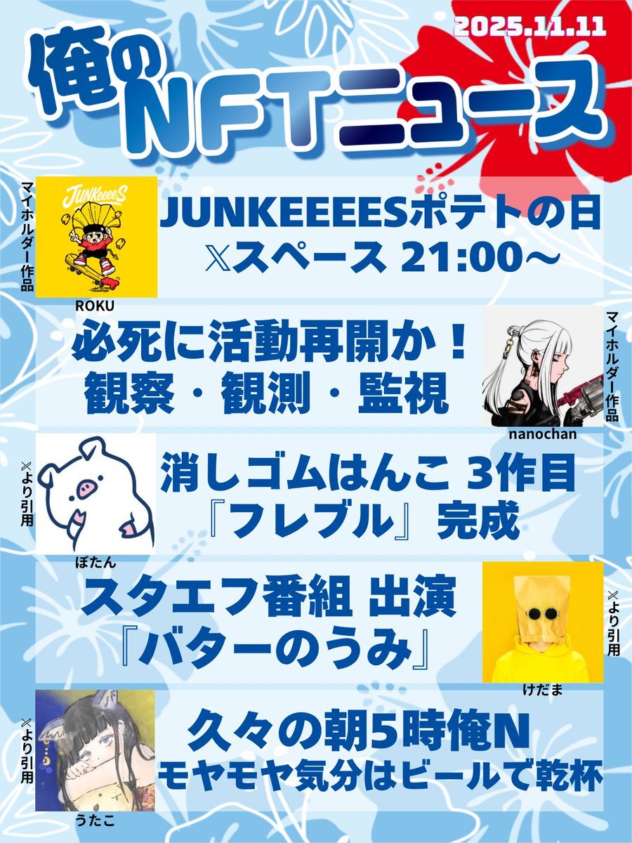 おはいび🌺 デザフェス、HEXA展、大おおがね祭とイベントで盛り上がってますね! もちろんどこにも行ってないけど、流れてくるポストみて楽しんでおります✨ 『11/16(日)俺のNFTニュース』