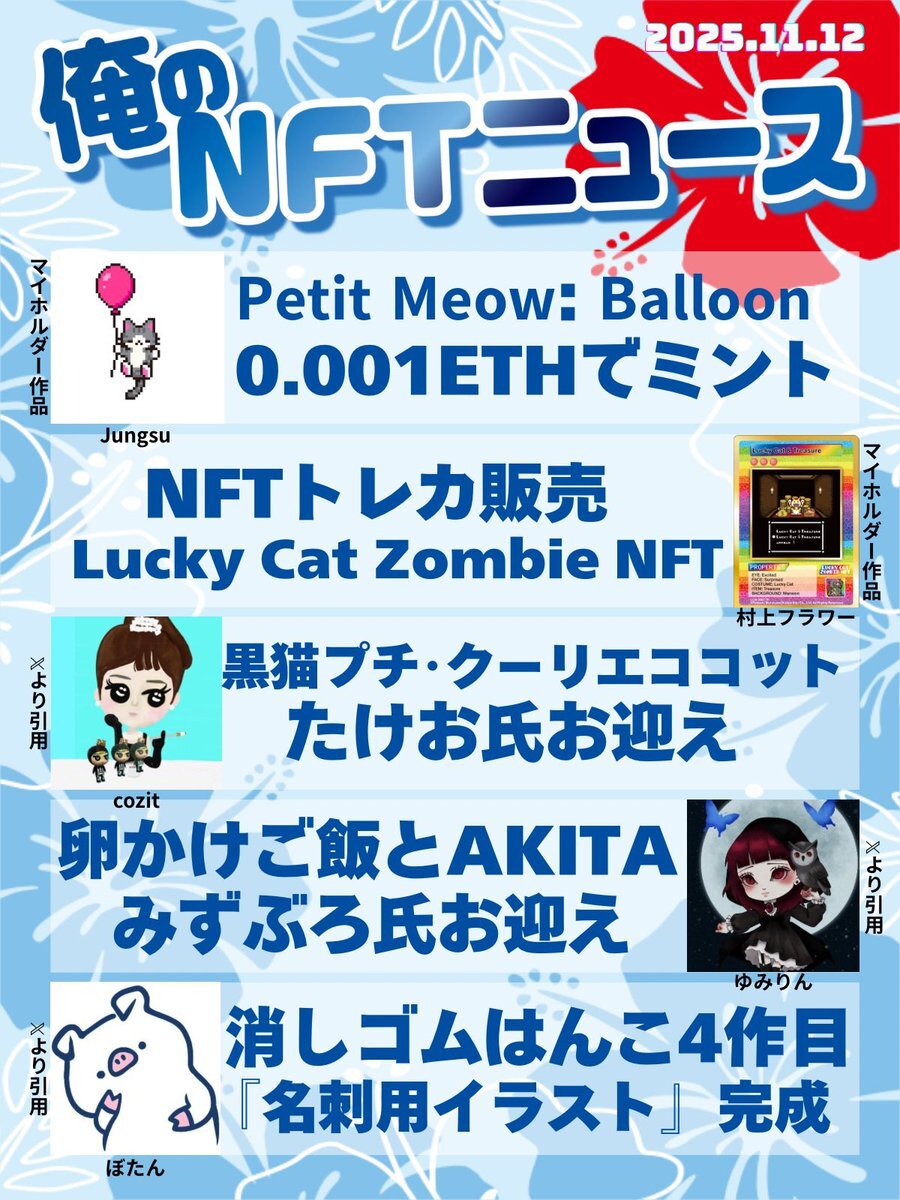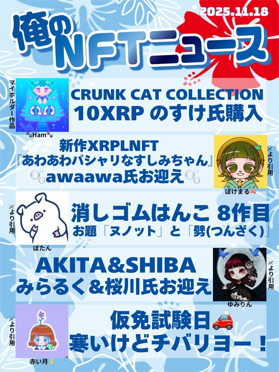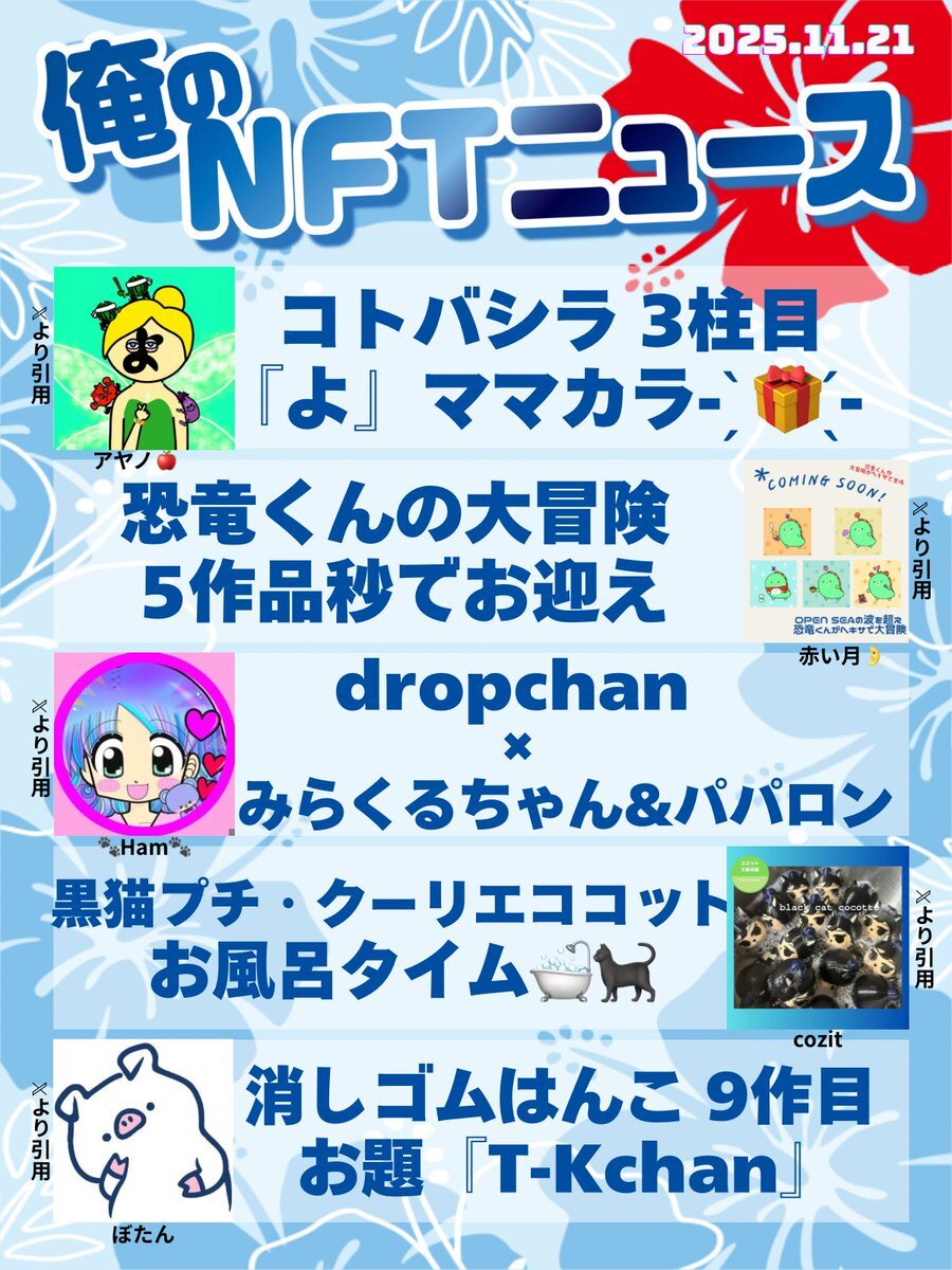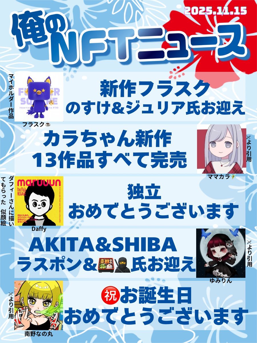 おはいび🌺 デザフェス、HEXA展、大おおがね祭とイベントで盛り上がってますね! もちろんどこにも行ってないけど、流れてくるポストみて楽しんでおります✨ 『11/16(日)俺のNFTニュース』
