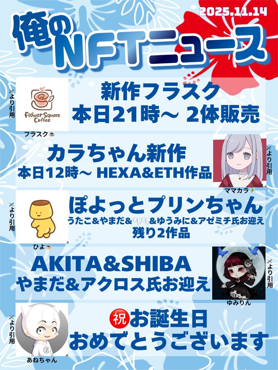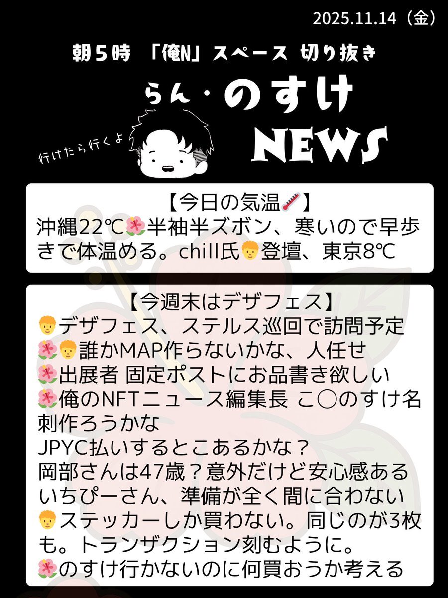 おはいび🌺 明日はデザフェスですね!!! お品書きポストやまだ準備終わらねぇなど賑わってますね😂 出られる方行かれる方たのしんで✨ 『11/14(金)俺のNFTニュース』