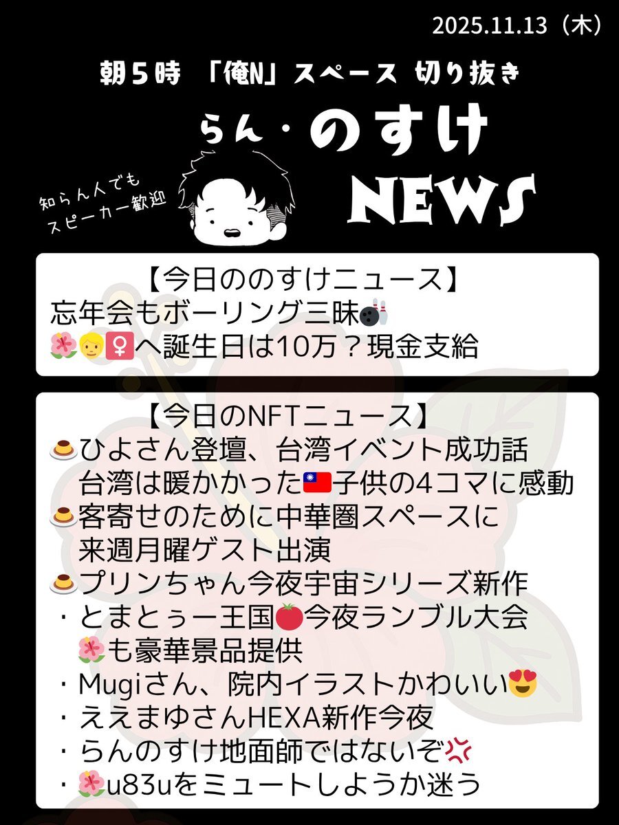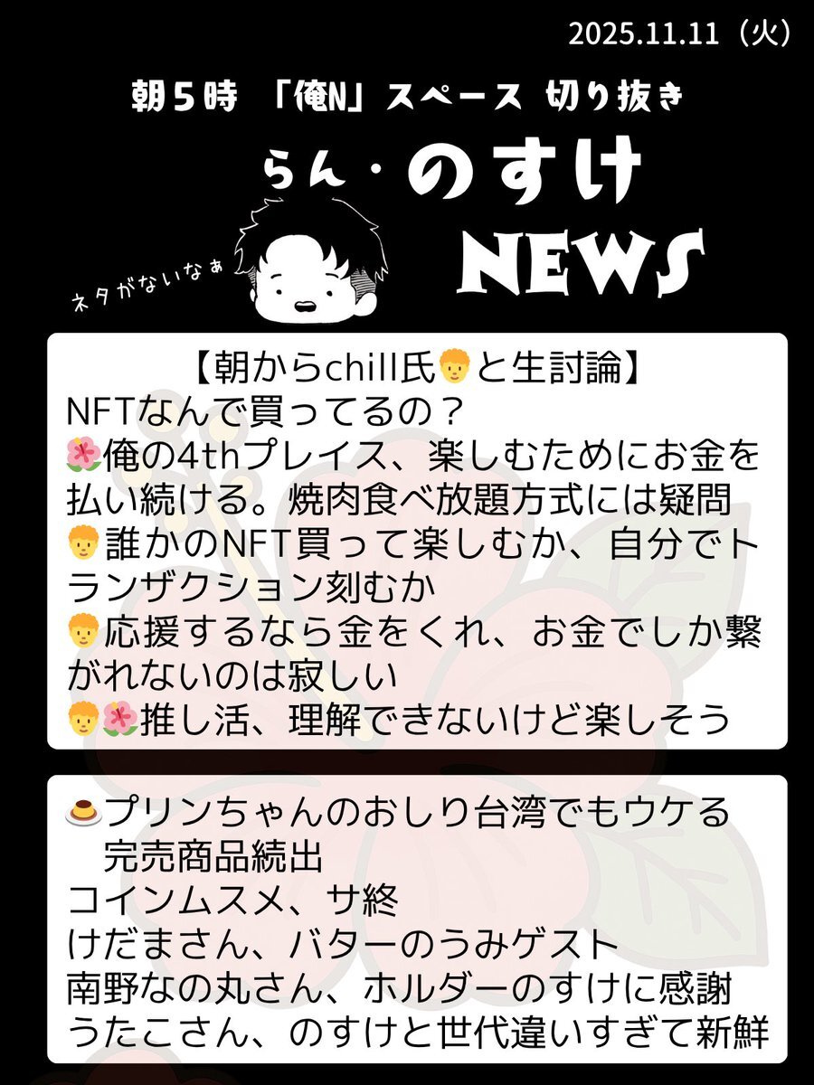 2025.11.8 らん『のすけ』ニュース🌺 朝5時録音なしの『俺N』スペースを愛をもって切り抜き✂️良いことですが情報量の多い日は取捨選択に時間がかかります☺️ #RNN pic.x.com/s4CSXaOgFB x.com/nosuke521/stat…