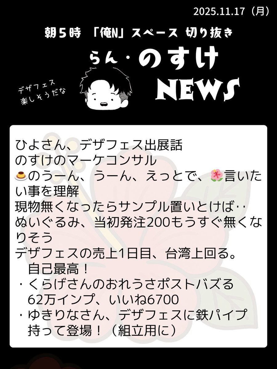 2025.11.14 らん『のすけ』ニュース🌺 朝5時録音なしの『俺N』スペースを愛をもって切り抜き✂️ 今週末はイベントたくさん✨デザフェス、鹿児島離島祭り、HEXA展示会 #RNN pic.x.com/GFP80hTs9Q x.com/nosuke521/stat…