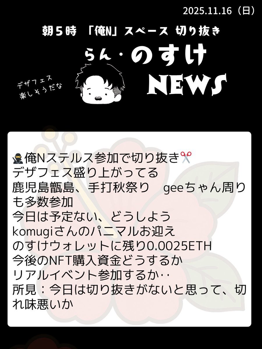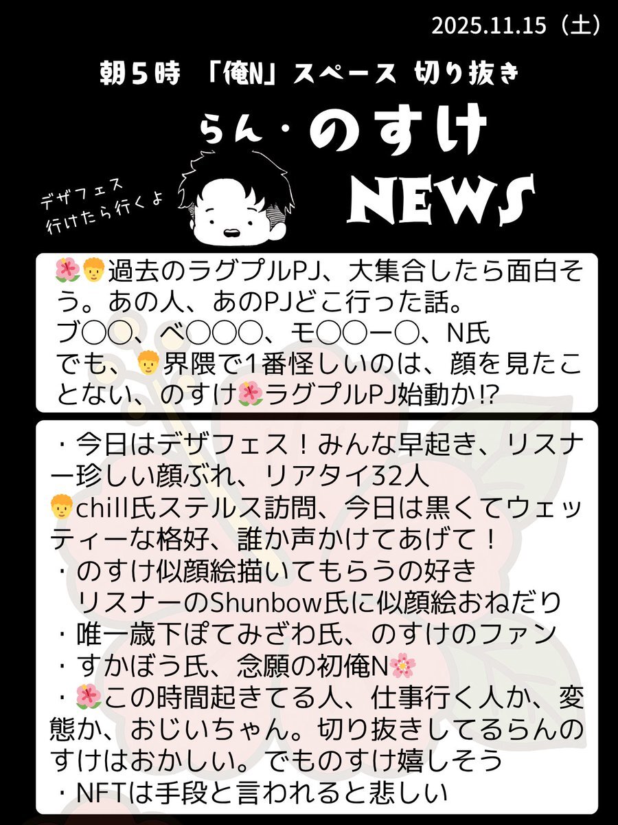 おはいび🌺 デザフェス当日!!! スペースにデザフェス出展される方も何名か来られてて、朝から準備や移動頑張って!と思いつつ、何も無いのに毎朝5時にスペースしてる俺ってもしかしてヤバい?とも思いました😂 『11/15(土)俺のNFTニュース』