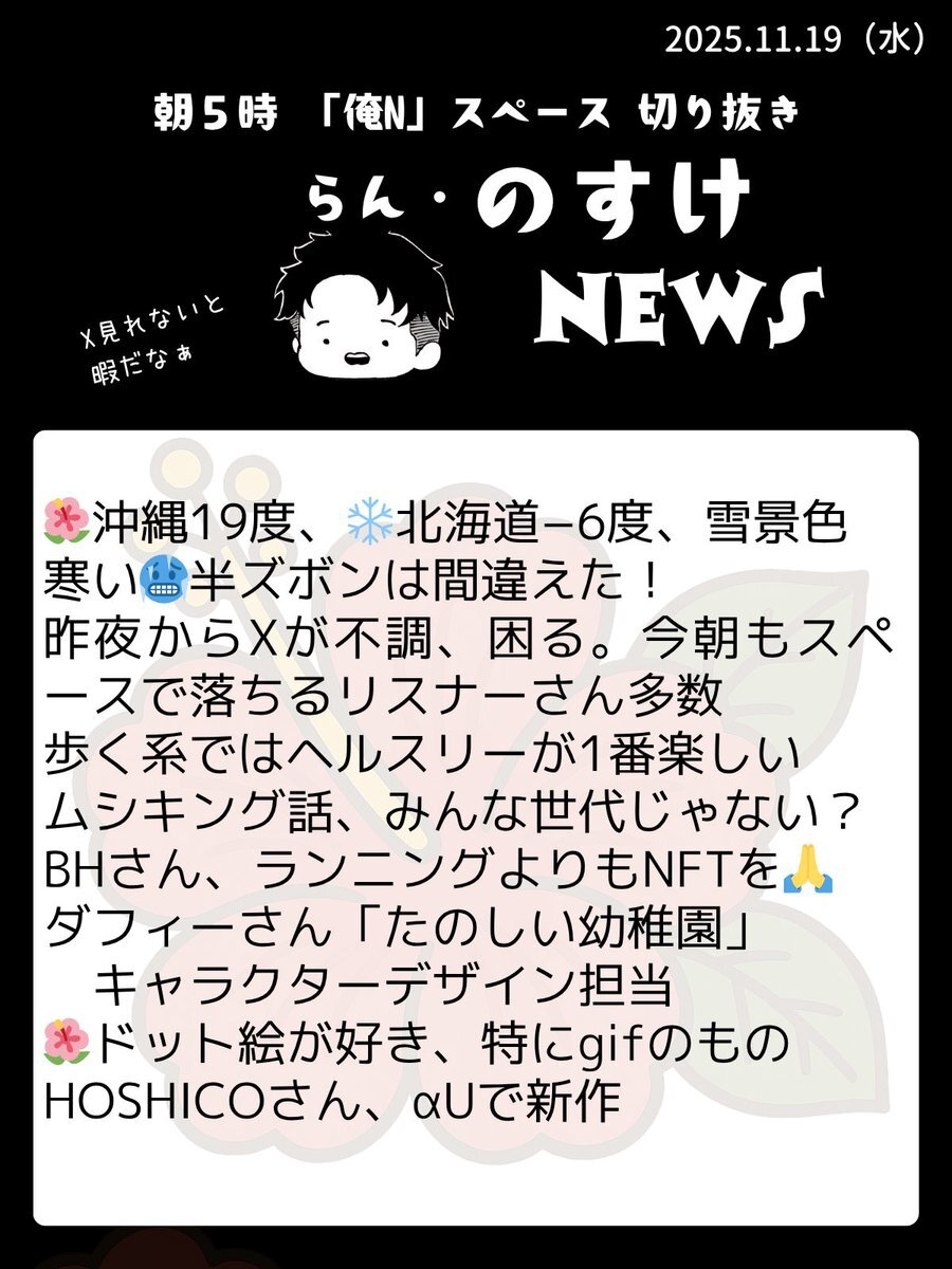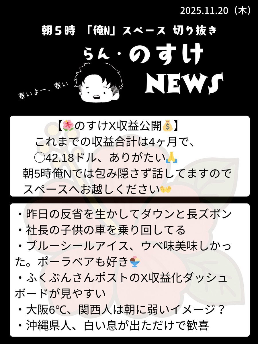 2025.11.20 らん『のすけ』ニュース🌺 朝5時録音なしの『俺N』スペースを愛をもって切り抜き✂️ 寒くなるとリスナー減るのかな?早起きのきっかけスペース #RNN pic.x.com/5Goji7MdHK x.com/nosuke521/stat…
