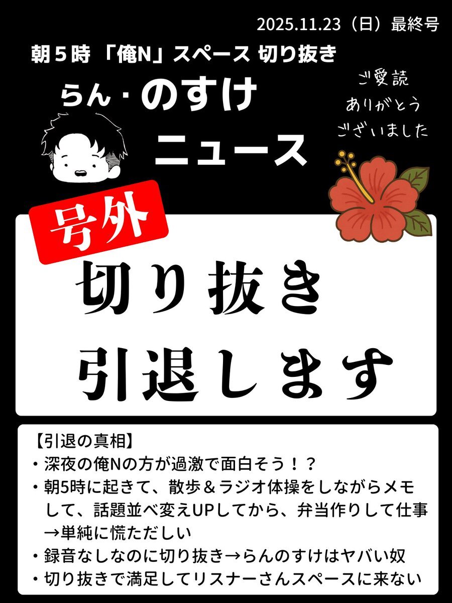 2025.11.23 らん『のすけ』ニュース🌺 【号外】大事なお知らせ 夏から毎日続けてきましたが、本日をもって廃刊しようと思います😌 変わらず、のすけファンなのでリスナーではいようと思います。 誰か切り抜き継承者はいないかな🙄 過去記事は、らん『のすけ』ニュースと検索頂ければ見られます📰 #RNN pic.x.com/xp5pCu8hCn