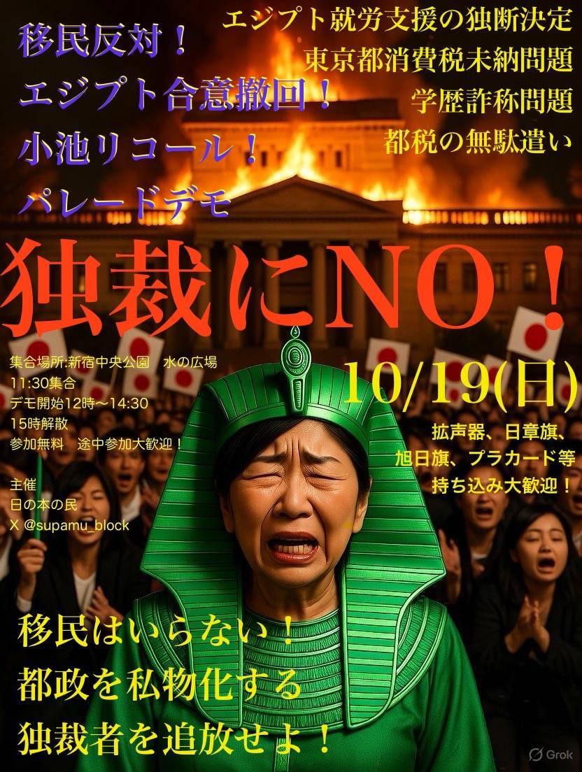 東京の新宿でパレードデモ決定しました 独裁者にNO‼️ 10月19日(日曜日) リレー大拡散お願いします #移民政策断固反対 #小池百合子リコール運動 #RTお願いします pic.x.com/PegD9viRGn x.com/usagidesyo/sta…
