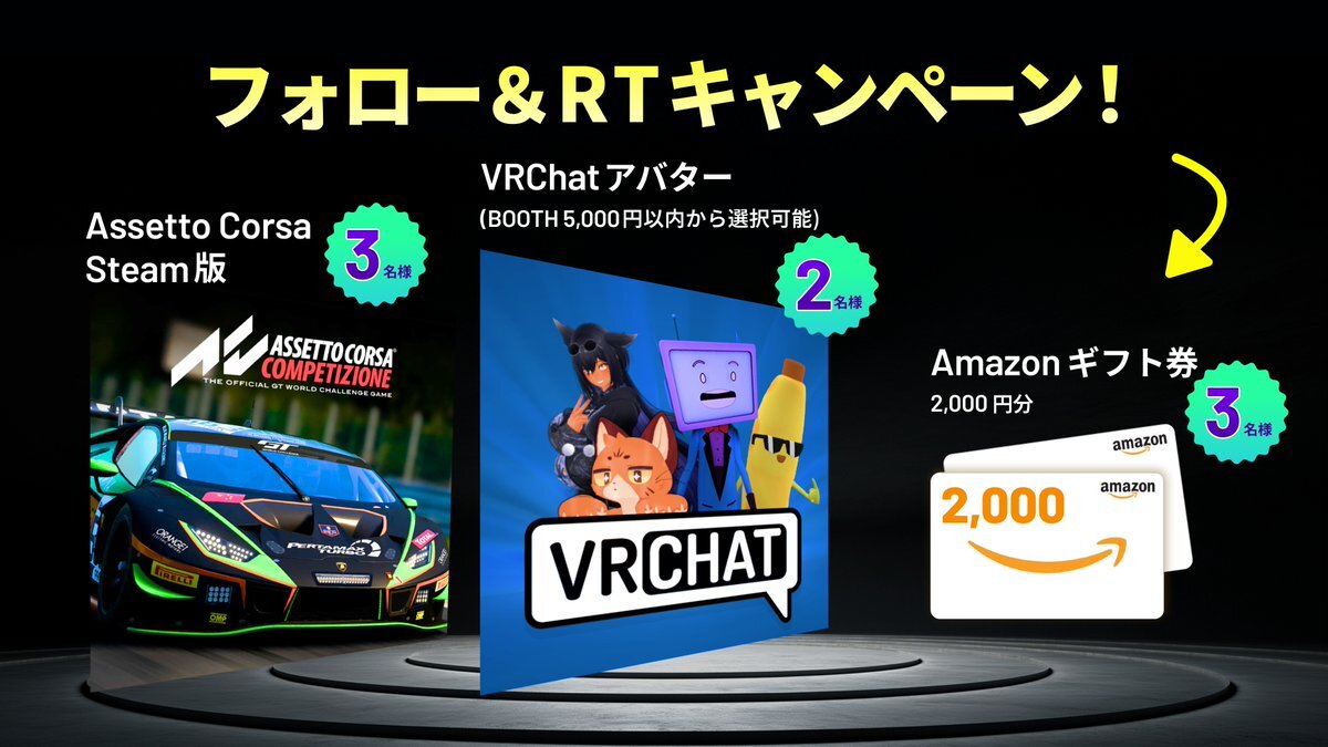 🚨【Black Fridayプレゼント企画】 Black Fridayキャンペーン詳しくこちら:x.com/Pimax_Japan/st… 日頃の感謝を込めて、8名様に当たる豪華賞品を大放出! フォロー&RTで応募完了!このビッグチャンスを見逃すな! 🎁 賞品内容: 1️⃣ Assetto Corsa Steam版 :3名様 2️⃣ VRChat アバター(BOOTH