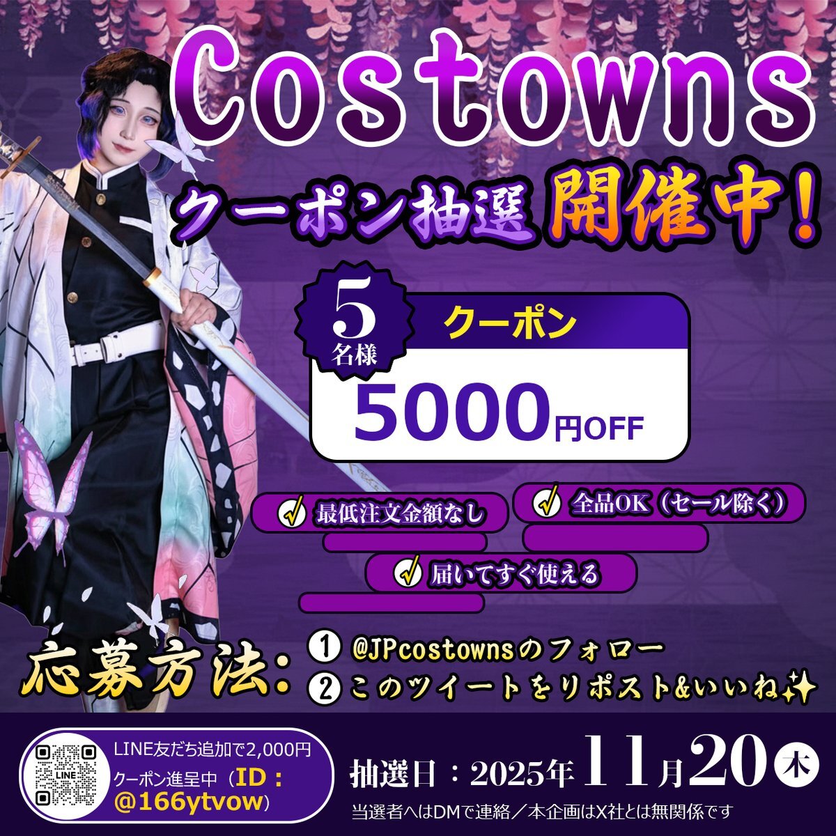 🍁🎁『11月クーポン抽選|第2弾』‼️ 5,000円×5名/全品OK/最低注文なし 📲 応募方法:@JPcostownsのフォロー&このツイートをリポスト&いいね✨ 📅 11/20(木)20:30〆切|当選はDM 👉 詳細 costowns.com/activity/5.html #costowns #RTキャンペーン #応募 #クーポン #コスプレ #コスプレ衣装 #変装 #当選 pic.x.com/5BWqVc3V5B