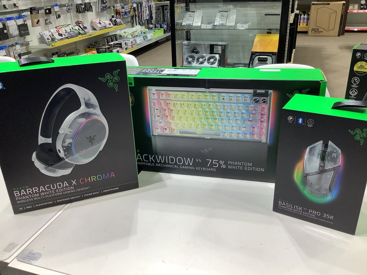 Razerのデバイスがスケルトンに!/ Phantom White Collection各種を展示中です👀 スケルトンのデザインがレトロ感と近未来感を両立しててカッコいいです😍 元々RGBライティングに定評のある #Razer デバイスのデザインが更に綺麗に輝きます✨ 是非当店7階へ、 実物を見て触りに来て下さい🥰 pic.x.com/p47QZXG5lW