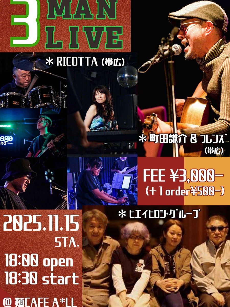 3MAN LIVE at 麺CAFE ALL 2025.11.15(土) 18:00 open 18:30 start Fee ¥3,000(+1 order ¥500) 2年ぶりにRicottaとご一緒で、なんと町田謙介さんとはお初! グッドミュージックで体も心も満たされていただきます🎵 ご予約待ってます。 #麺カフェall #ricotta #町田謙介 #ヒエイヒロシグループ pic.x.com/ZLdUq59Vqn