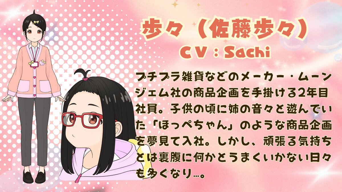 ❤️キャラクター紹介❤️ 歩々(佐藤歩々)(CV:#Sachi) プチプラ雑貨などのメーカー・ムーンジェム社の商品企画を手掛ける2年目社員。 子供の頃に姉の音々と遊んでいた「ほっぺちゃん」のような商品企画を夢見て入社。 しかし、頑張る気持ちとは裏腹に何かとうまくいかない日々も多くなり…。 pic.x.com/7BrSltEMpg