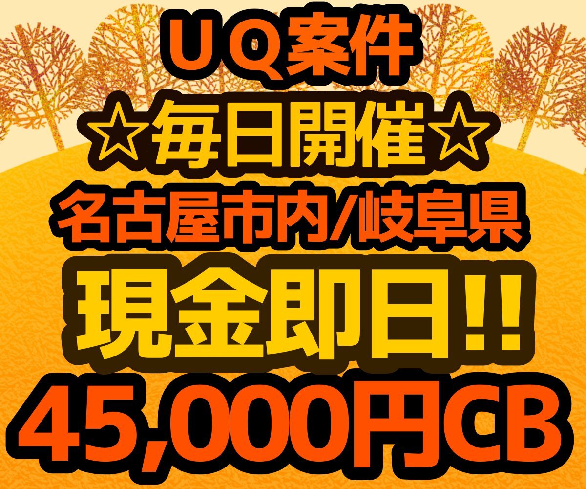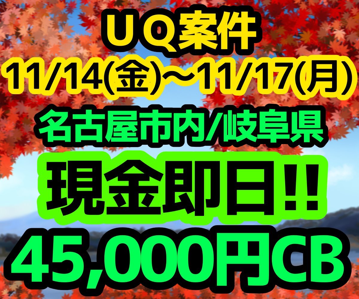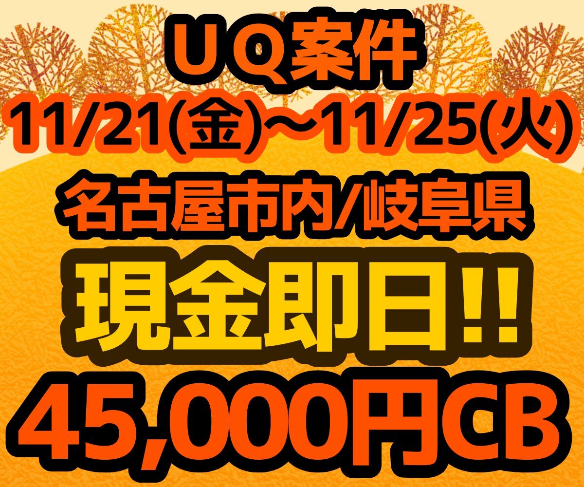 週末受付中です! アラートもご相談下さい! 👸UQ案件 愛知県 名古屋/岐阜エリア👸 📅11/14~11/25 💰SIM 現金45000円💰 📱機種一括+現金25000円💰 初月トクトク2🆗 詳細はフォロー&DMにて詳細希望✉️ #UQ #東海 #愛知 #岐阜 #SIM単体 #MNP #乗り換え