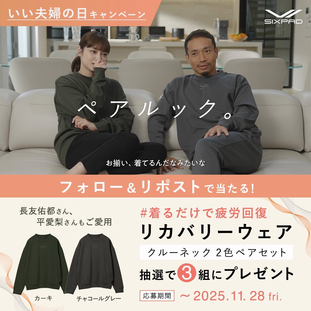 /​​ フォロー&リポストで​ 話題の「リカバリーウェア」が当たる🌟​ いい夫婦の日 キャンペーン💐​ \​ ​ 長友佑都さん、平愛梨さんご夫妻もご愛用💝​ 着るだけで血行促進&疲労回復🫧 ​ SIXPADの​「リカバリーウェア」クルーネック​ ペアセットを3組(計6名様)にプレゼント🎁​ ​ 【参加方法】