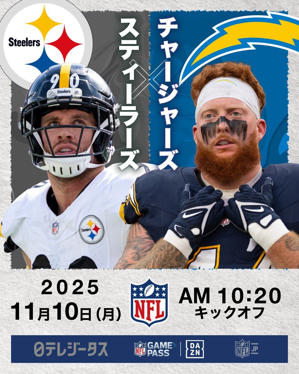 まもなくシーズン第10週 #サンデーナイトフットボール ✨ 🏈スティーラーズ🆚チャージャーズ ⏰10時20分 📺💻📱@Gtasu | #NFLGamePassOn @DAZN_JPN #SNF #PITvsLAC #NFLJapan pic.x.com/QG5Kh1nfBZ