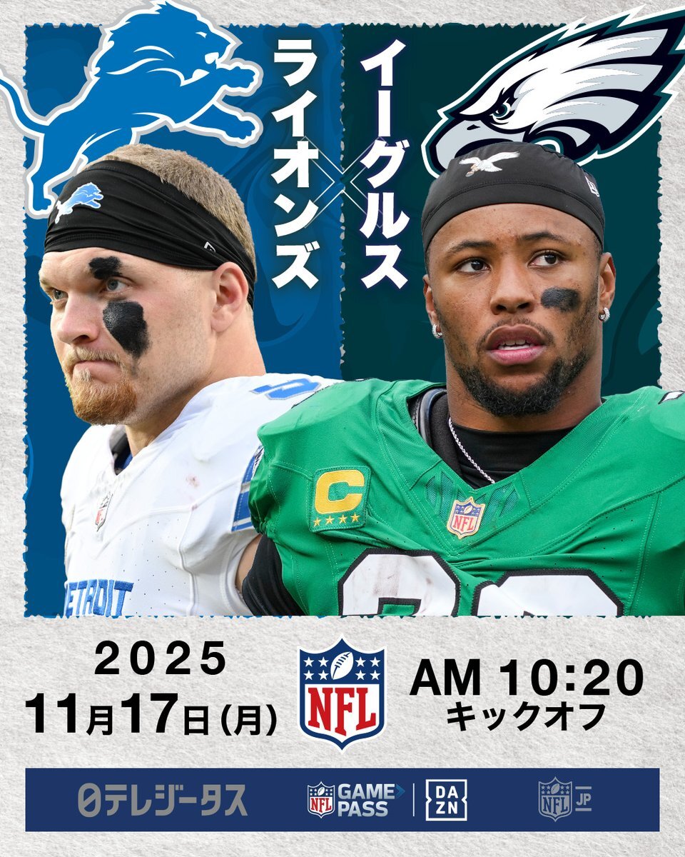 シーズン第11週 #サンデーゲーム の大トリはライオンズ🆚イーグルス💥 このあと⏰10時20分キックオフ 🏈✨ 📺💻📱@Gtasu | #NFLGamePassOn @DAZN_JPN #SNF #DETvsPHI #NFLJapan pic.x.com/cI2AmserFa