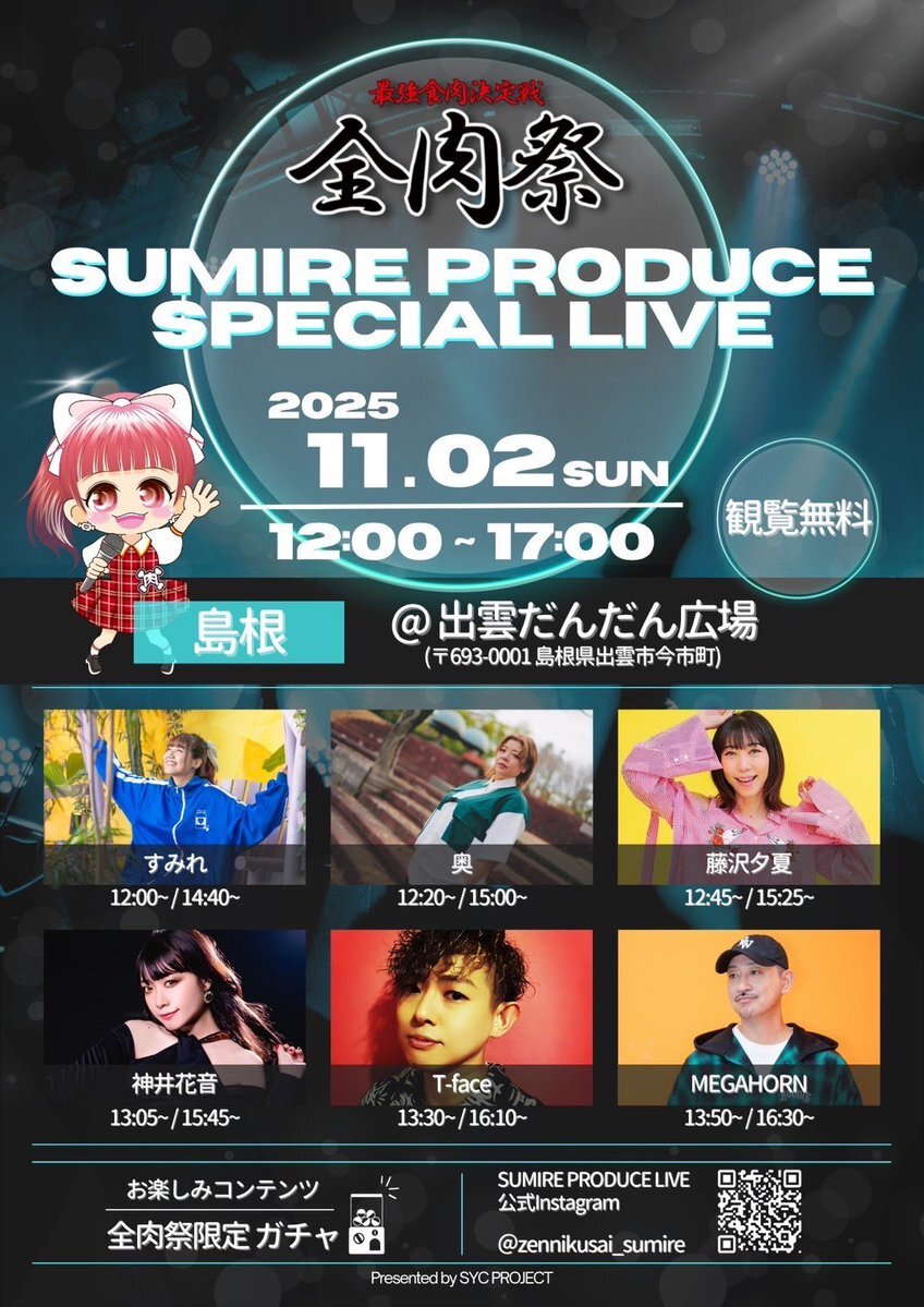 【⚠️LIVE情報⚠️】 2025.11.2(日) 島根県県出雲市 『 #出雲全肉祭 - #SPECIALLIVE - 』 に出演します! ⭕️13時30分.16時10分出演⭕️ #観覧無料 雨具と防寒具を ご用意いただいて ぜひご来場下さい! 皆様お待ちしてます🙌✨ #島根県 #出雲だんだん広場 #全肉祭 #出雲 #雨天決行 pic.x.com/Vwd3JYOzlY