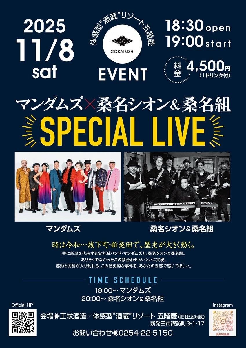 2025年11月8日(土)新発田市王紋酒造、酒造リゾート五階菱にて念願が叶います!! この様な機会は滅多にございませんので、ご予約はお早目にお願いいたします🙏 楽しい夜になる事間違いなしです♪ お待ちしております! #マンダムズ #桑名シオンand桑名組 #王紋酒造 #酒造リゾート五階菱 #SpecialLIVE pic.x.com/b5lq5VkFVc