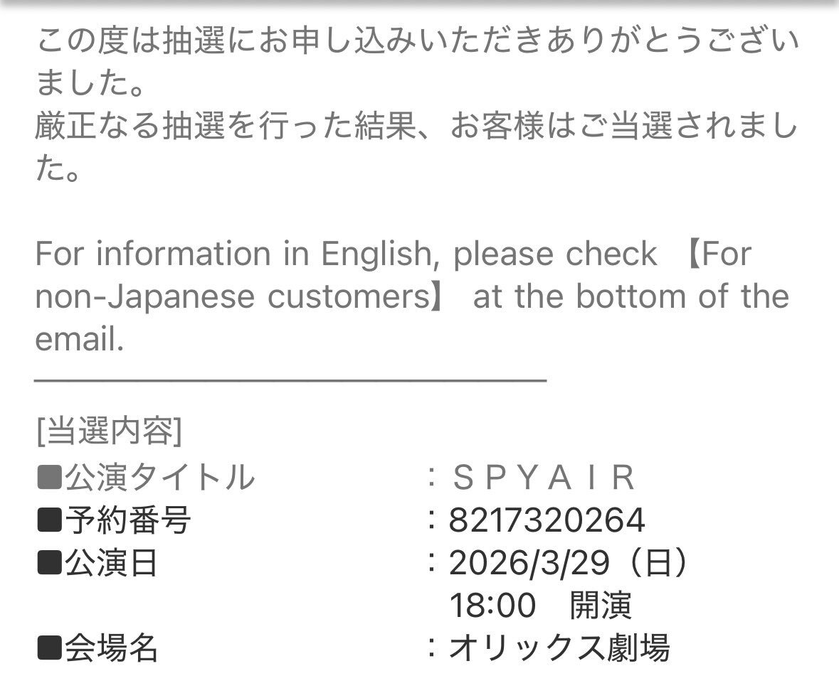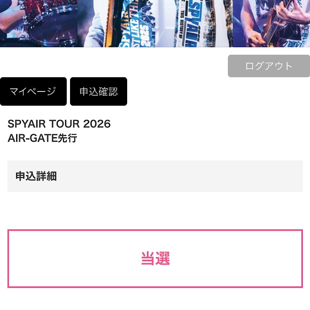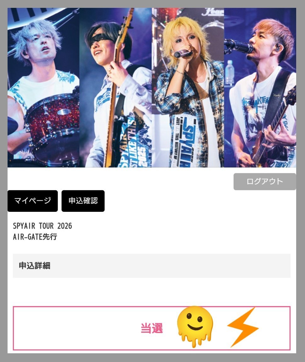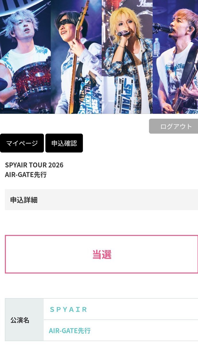 ホール編、全当選してたーーーっ ライブハウス編(神奈川、岡山、広島) ホール編(千葉、大阪、愛知) 計6公演(最多)、ちょー楽しみにしております!!! #SPYAIR #SPYAIRTOUR2026 pic.x.com/HCYwFiZln9