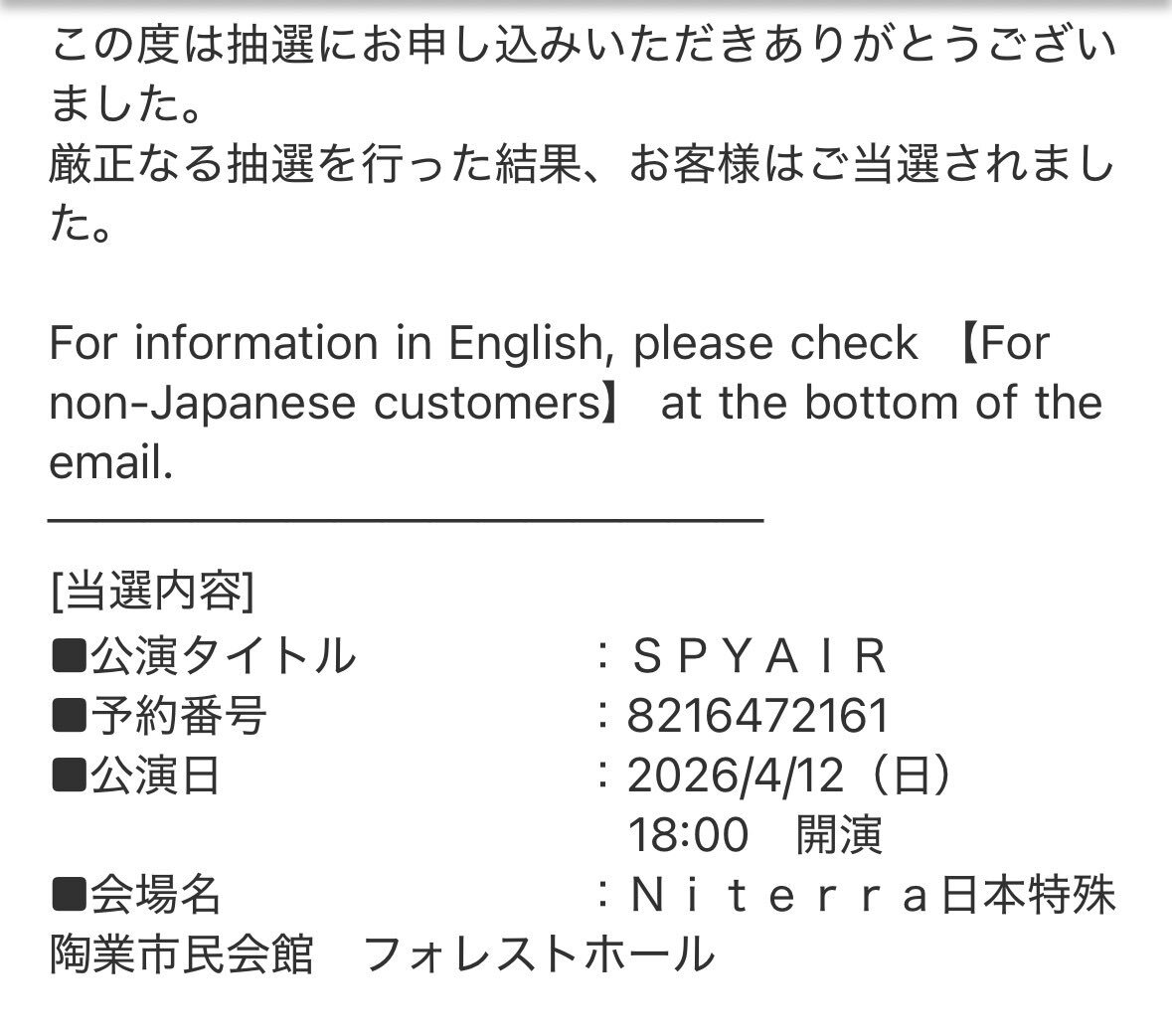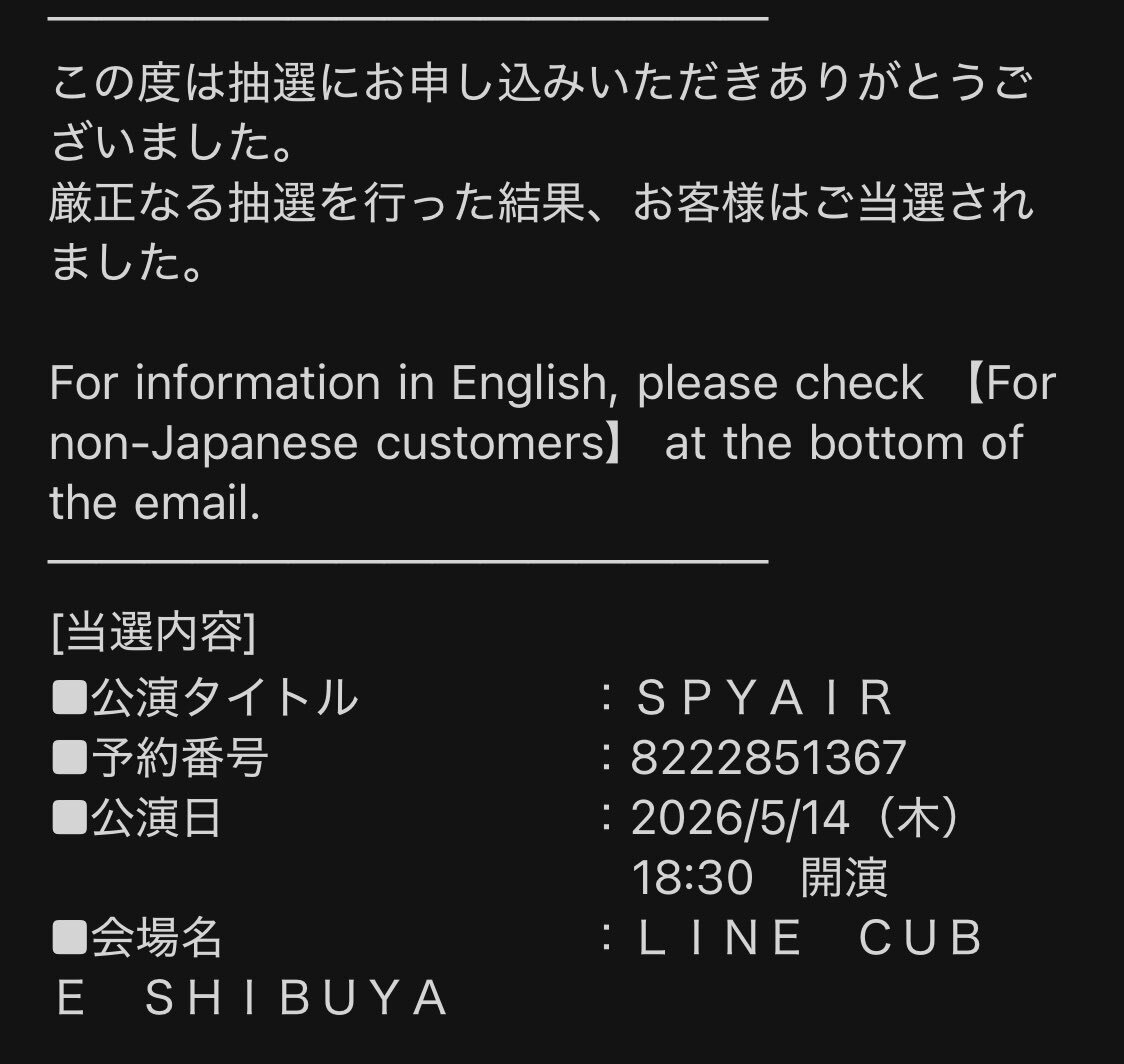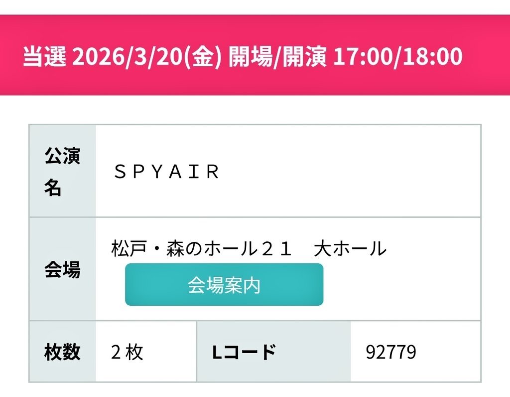 ホール編、全当選してたーーーっ ライブハウス編(神奈川、岡山、広島) ホール編(千葉、大阪、愛知) 計6公演(最多)、ちょー楽しみにしております!!! #SPYAIR #SPYAIRTOUR2026 pic.x.com/HCYwFiZln9
