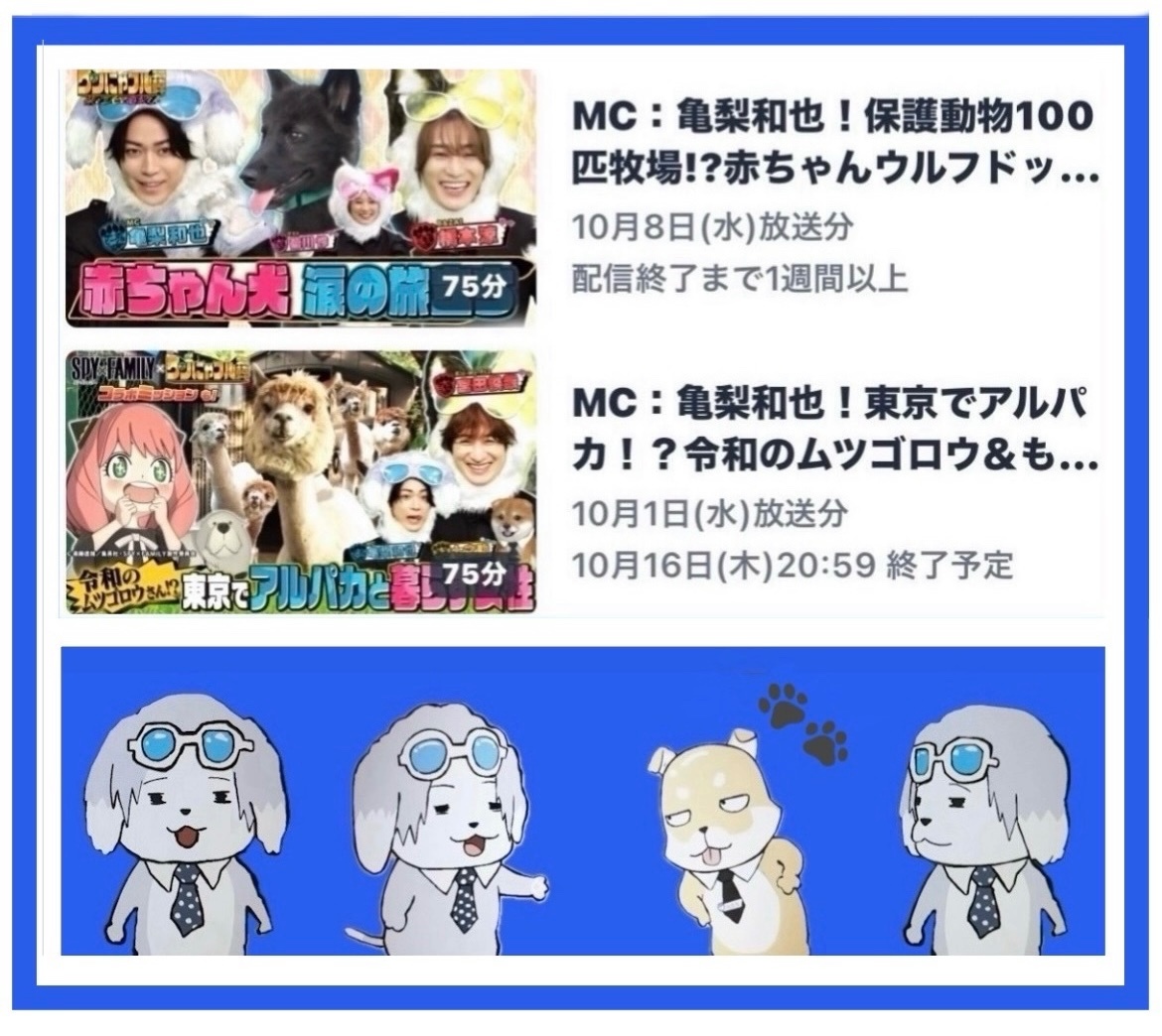 【世界を救う!ワンにゃフル物語~柴と三毛と亀梨くん~】 TVer見逃し配信してます ✳️10月1日放送【『#SPY_FAMILY』コラボミッション 特別漫画『ボスと七之助 秘密結社』…他】 ✳️10月8日放送 【保護動物100匹牧場!?赤ちゃんウルフドッグ…他】 pic.x.com/M9rPWIG7cO