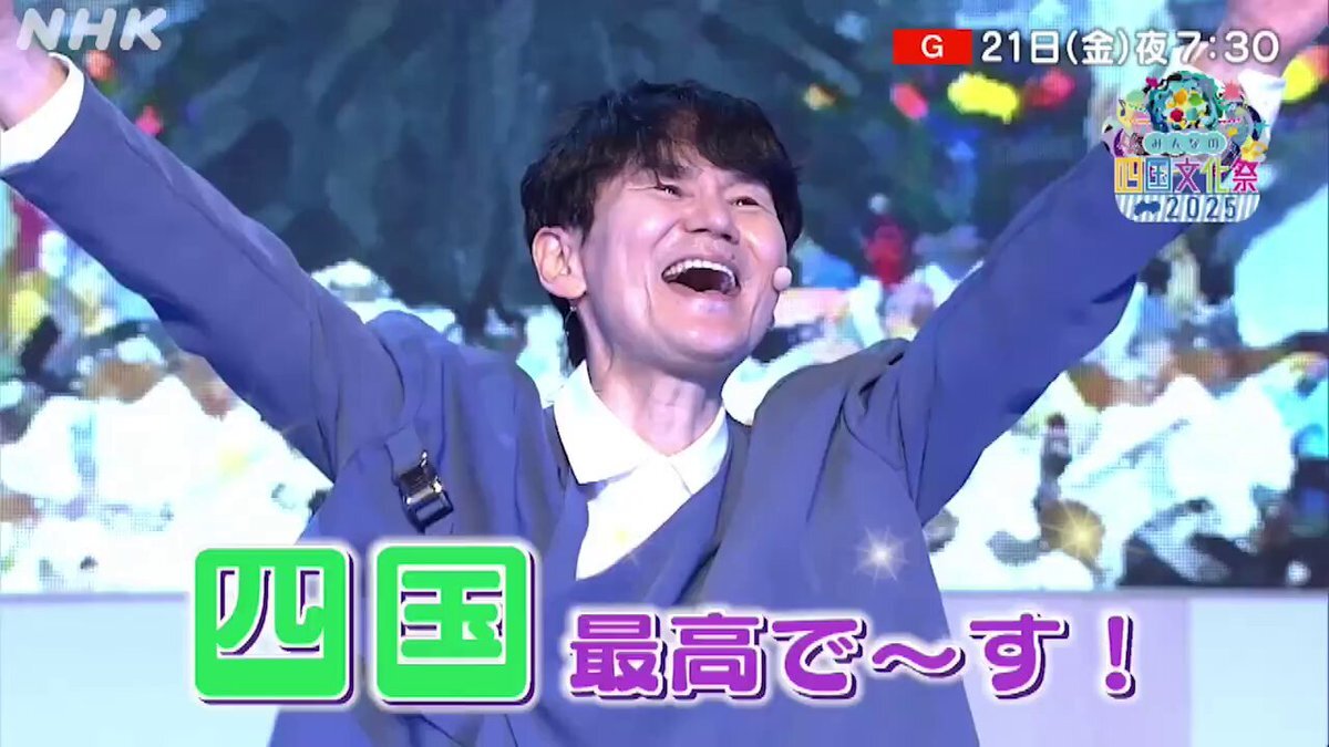 📣あす放送 【みんなの四国文化祭2025】 #四国 ゆかりのアーティストが歌の競演💫 🍍司会 #南原清隆 🎤出演 #三山ひろし #STU48 #松本明子 #アンジェラ・アキ(VTR出演) ほか 🌟ナレーション #水樹奈々 🔻放送後はNHK ONEで配信 web.nhk/tv/an/shikoku-… 📺11/21(金)19:30~NHK総合(※四国4県)