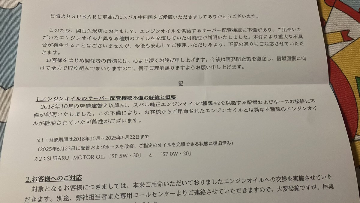 なんかスバル車乗ってた時のディーラーから手紙が来たんやけど これずっとオイル違うの入れてるでしょって聞いてたのにそんなミスするわけねーがって言われたのに今更すぎん この時めっちゃ整備しにバカにされたの今だに覚えてる