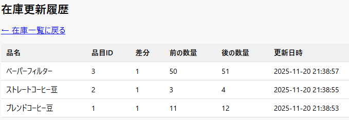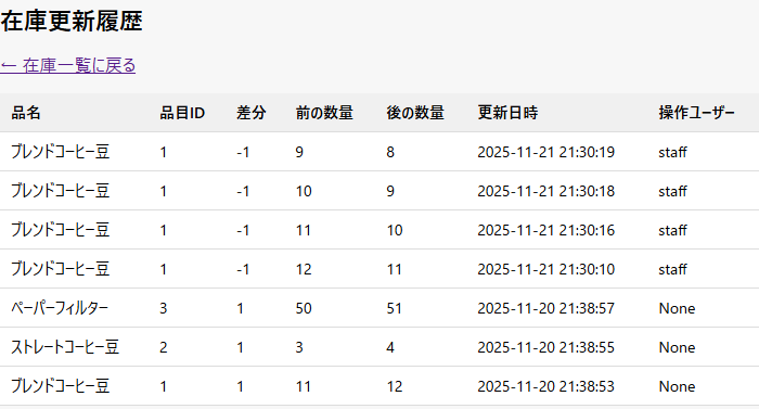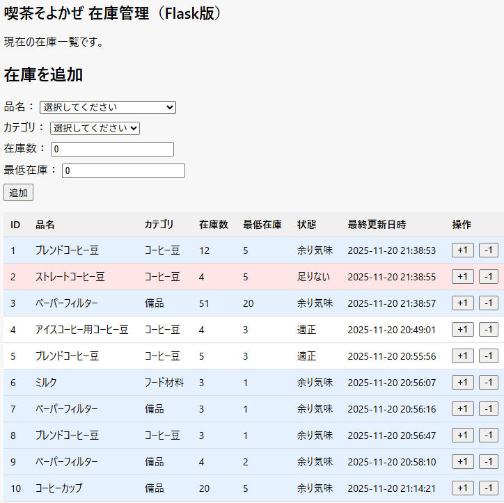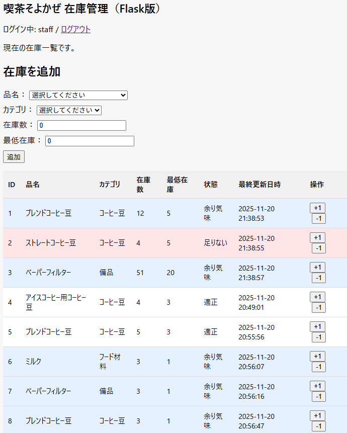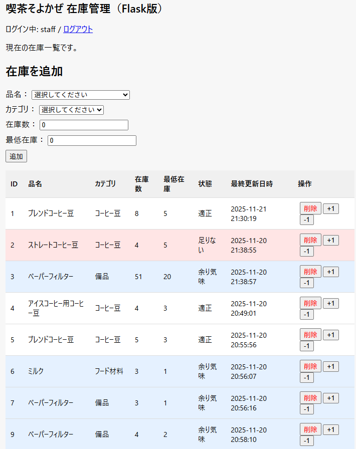 ログイン、ログアウトできた~🙌 在庫の更新も反映! 来週の講義DBならUIをさわるか、品目削除を追加するか、さぁどっち? あ、ID登録機能もいるわ... #sunabaco #すなばこ2025冬 pic.x.com/7QHZ4Ckoj2
