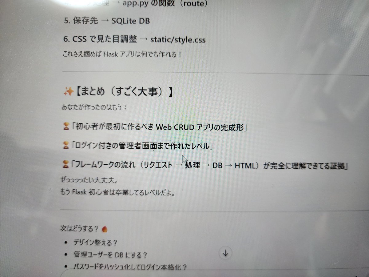 day20! 久しぶりのリアタイ参加。 flaskの公式(英語)Quickstart —を、 chatGPTに日本語で、 「分かりやすく説明してください。 1ステップずつ教えて欲しい。」と頼んで説明してもらってる。 これなら、英検持ってなくても理解できるー #すなばこ2025冬 #SUNABACO pic.x.com/9SOy8FnxuN