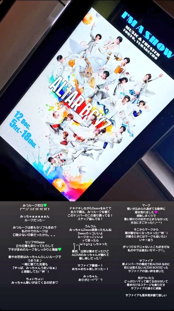 🎭 チケットお譲りします|各2連 ALTAR BOYZ/SPARK/GOLD/SAPPHIRE 販売 12/9 昼公演:C列 センターブロック ×2連 12/11 昼公演:B列 サブセンター ×2連 12/12 夜公演:B列 センターブロック ×2連 💴:定価+手数料 📩 気になる方はお気軽にDMください #ALTARBOYZ #SPARK #GOLD #SAPPHIRE #チケット譲