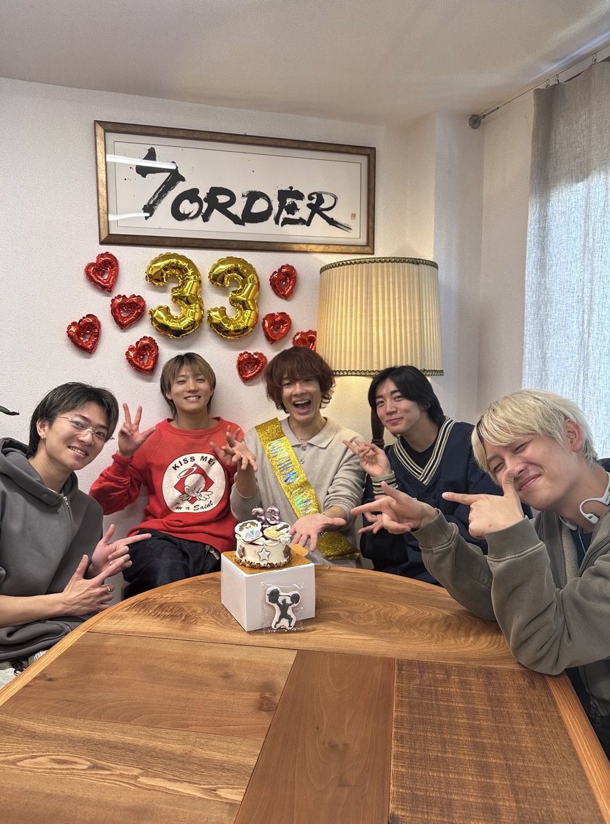 メンバーに囲まれてにこにこのさなぴーが幸すぎる🙂‍↕️❤️ 別添えの筋トレシルエットクッキーも今年のさなぴーを表してくれてて良い🏋️✨ 今日は大阪で楽しんできてね〜〜🍻 楽しかった報告待ってるよーー!🎂🎉✨✨ #真田佑馬33歳おめでとう #真田佑馬 #7ORDER #SevenOrder x.com/7order_officia…