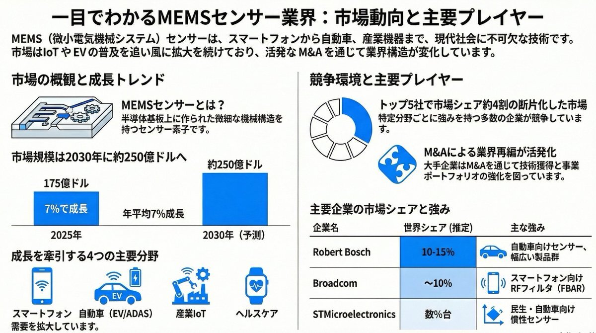 2兆円市場へ成長するMEMSセンサー業界の主要プレーヤーとM&A、最新技術動向を1枚のスライドにまとめてみた #Bosch #Broadcom #STMicroelectronics #TDK #村田製作所 pic.x.com/xm50brdqzq