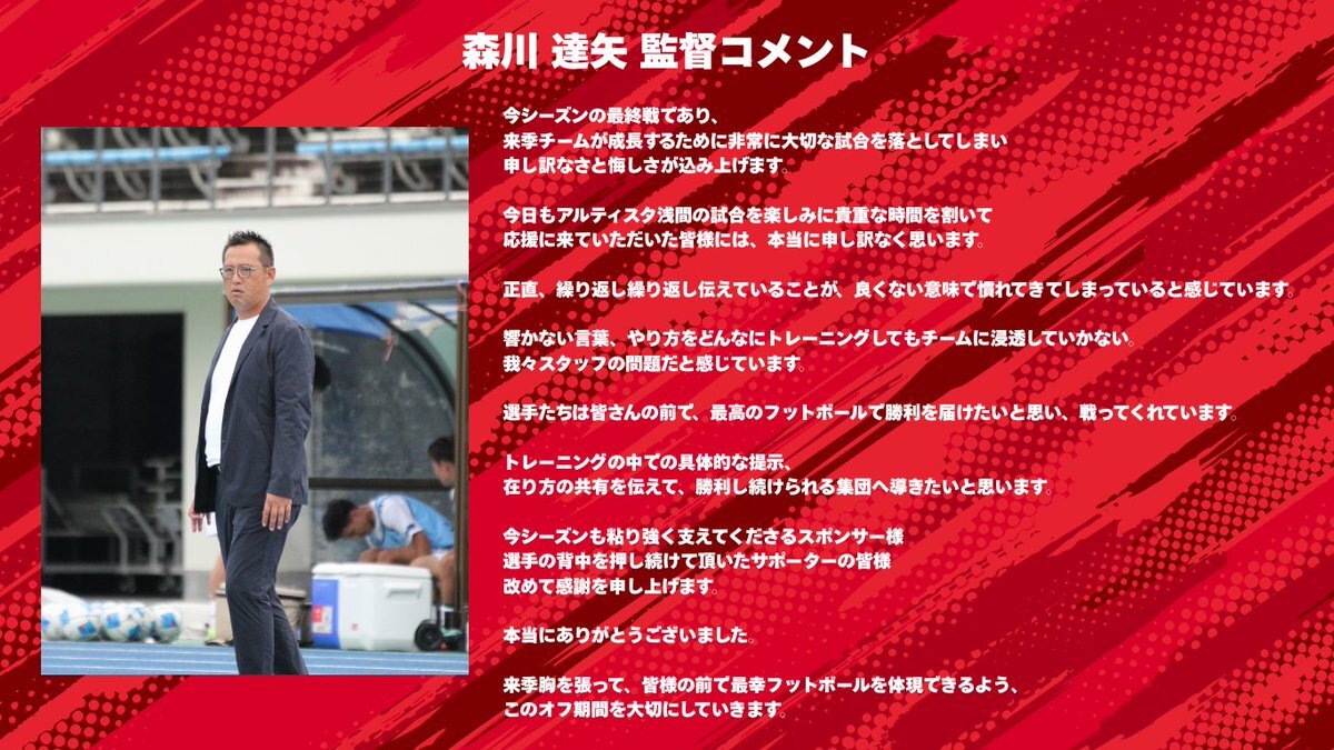 【FULL TIME】 🆚#アンテロープ塩尻 前半:0-1 後半:0-0 シーズン最終戦でサポーターの皆さんに勝利を届けることが出来ず非常に悔しい想いです。 今後も来季に向けて自分たちにできる最高の準備をしていきます。 本日も熱い応援、誠にありがとうございました! #アルティスタ浅間 #TEPPEN pic.x.com/gHIVQ1EGAD