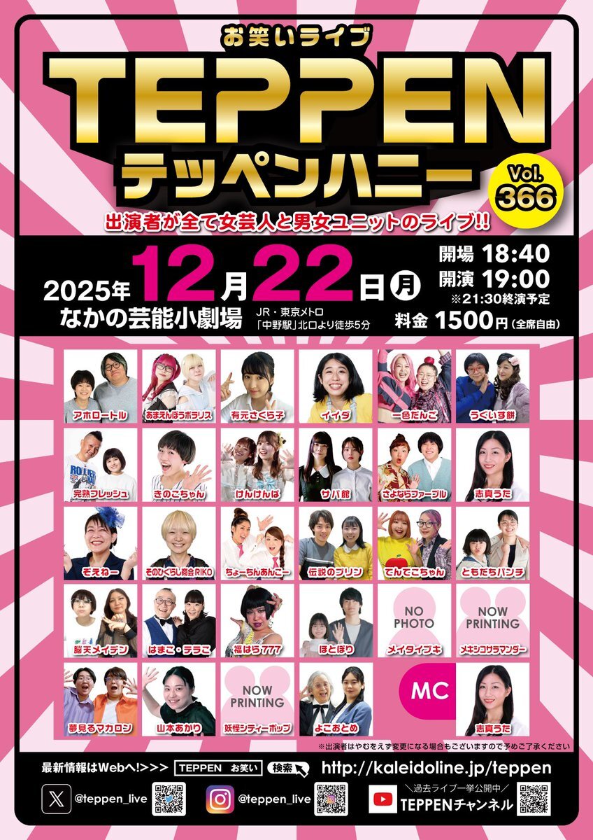 / 出演者が全て女芸人💃と男女ユニット👫のライブ \ ◥◣TEPPEN.366 テッペンハニー◢◤ 🗓12月22日(月) ⏰開場18:40 開演19:00 📍なかの芸能小劇場 🎫1500円 🖥kaleidoline.jp/teppen/ 🌈出演者 うぐいす餅 / 完熟フレッシュ / きのこちゃん / けんけんぱ / サバ館 / さよならファーブル /他