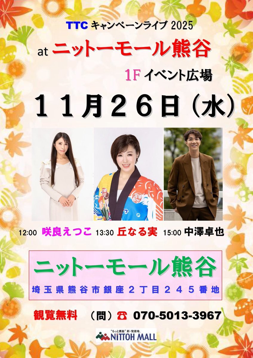 🌸次回の咲良満開🌸 26日(水) ニットーモール熊谷 TTCキャンペーンライブ 12:00〜 #咲良えつこ 13:30〜 #丘なる実 さん 15:00〜 #中澤卓也 さん 11月ラストです🍂 よかったら愛にいらしてください👸🫶 #TTCさいたま #埼玉県