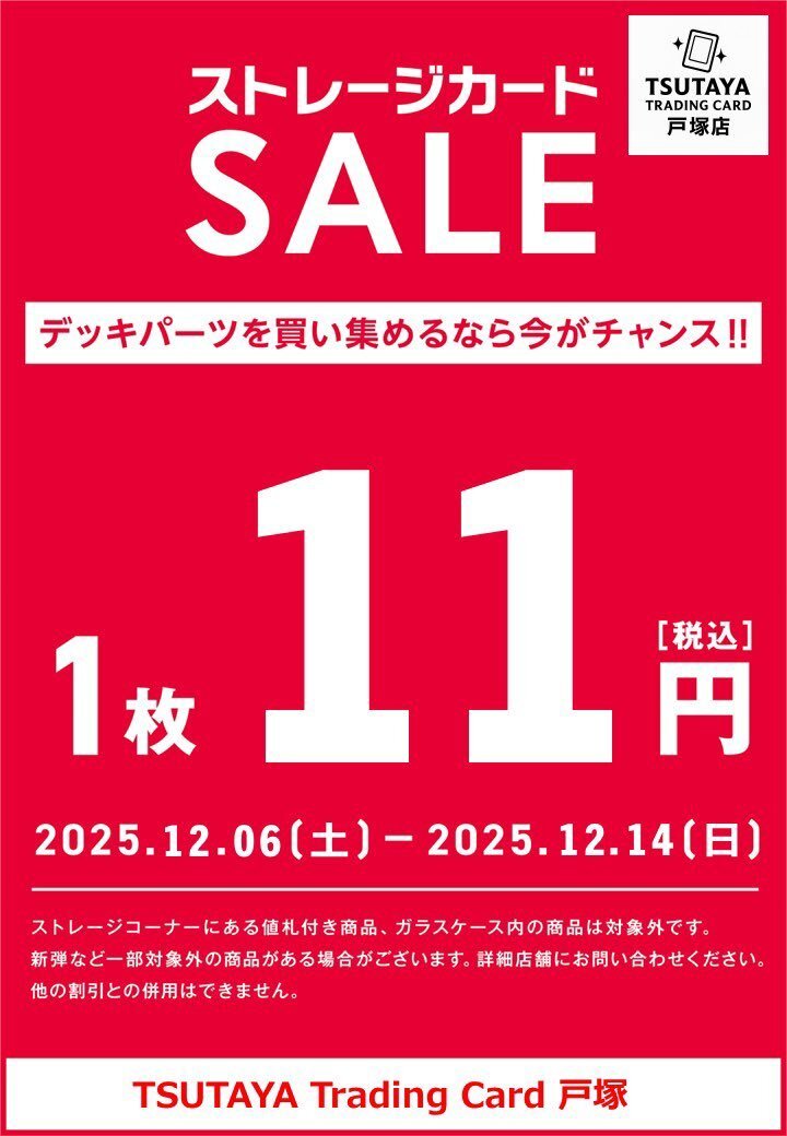 【セール情報】 2025年12月6日(土)~2025年12月14日(日)まで ストレージ内のカードが全て 33円→11円‼️ この機会にデッキパーツを買い集めるのも良し! 掘り出し物を見つけに行くのも良し! ご来店お待ちしております #TTC #TSUTAYA戸塚 #戸塚モディ pic.x.com/aIc98juXqp