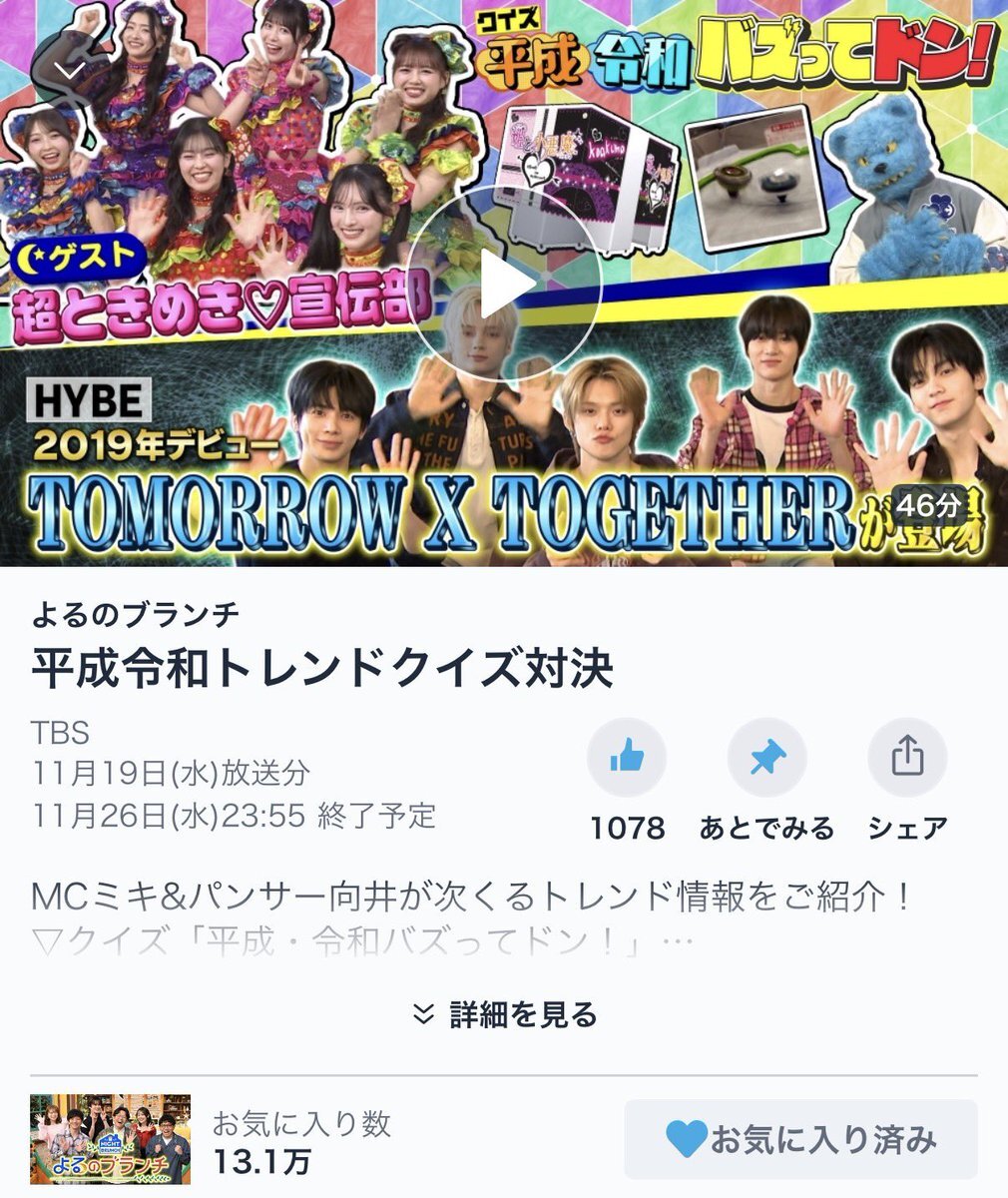よるのブランチ 関西では観られない〜って思ってたらTVerで観られたよ😭 Tomorrow×Togetherは、いつ見ても可愛くてかっこよくていい人感がハンパない 11/26までですよー #TVer #Tomorrow×Together #TXT tver.jp/episodes/epd8p…