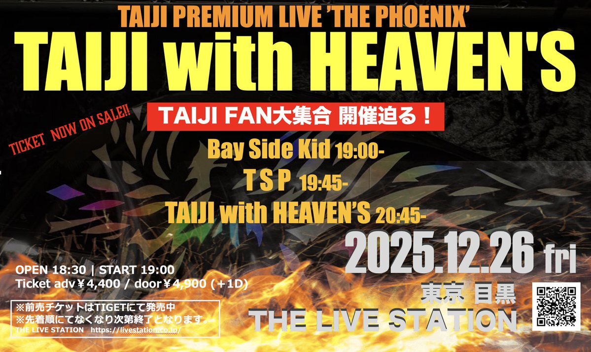 【タイムテーブル発表😎】 TAIJI with HEAVEN’Sは20:45からの出演になります🎤 [Live info] 2025.12.26(金) TAIJI PREMIUM LIVE ”THE PHOENIX” TAIJI with HEAVEN'S OP18:30|ST19:00 目黒LIVE STATION 🎫Ticket発売中 tiget.net/events/423626 #TAIJI #大集合 pic.x.com/gmUAdA6aN9